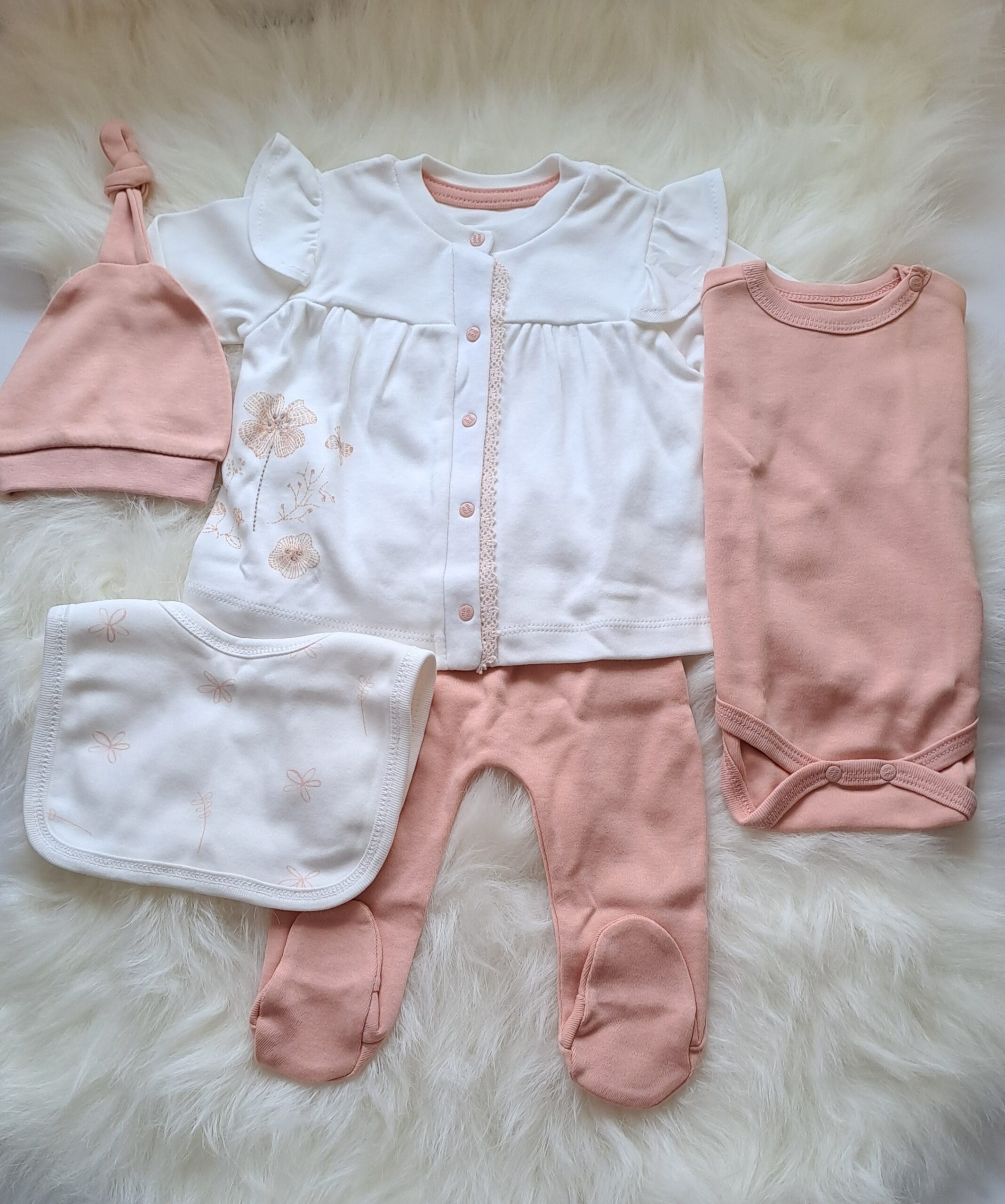 Çiçekli, önden çıtçıtlı, pamuk fisto detaylı; setimiz üst zıbın, patikli pantalon, çıtçıtlı mama önlüğü, kısa kollu alttan çıtçıtlı badi ve bağlamalı bereden oluşmaktadır. 0-3 ay (56-62 cm) kullanımına uygundur. Bebeğinizin hassas cildi için en doğal ve en kaliteli seçim. Set, sade ve modern tasarımlı çizgilere sahiptir. Güvenlik standartları ile üstün konforu bir araya getiriyor. Üretim aşamasında bebeğinizin sağlığına zarar verecek kimyasallar kullanılmamıştır. Ürünün yüksek kalite standartları, dünyanın en prestijli tekstil sertifikalarından biri olan OEKO-TEX Gold belgesiyle tescillenmiştir.