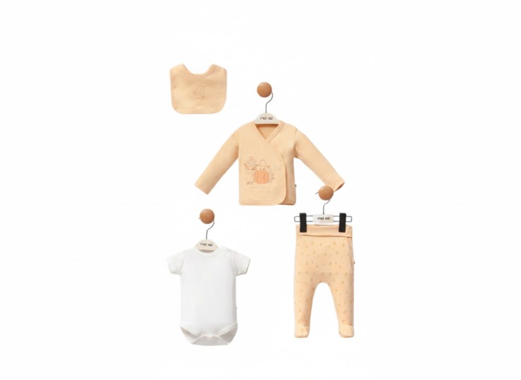 Önden kruvaze kuş detaylı balkabaklı sonbahar tasarımlı bağlamalı bere detaylı setimizin içerisinde; üst zıbın, patikli pantalon, çıtçıtlı mama önlüğü, kısa kollu alttan çıtçıtlı badi ve bağlamalı bere bulunuyor, kendinden eldivenli ve unisex modeldir.5li zıbın seti 0-3 ay (56-62 cm) kullanımına uygundur.