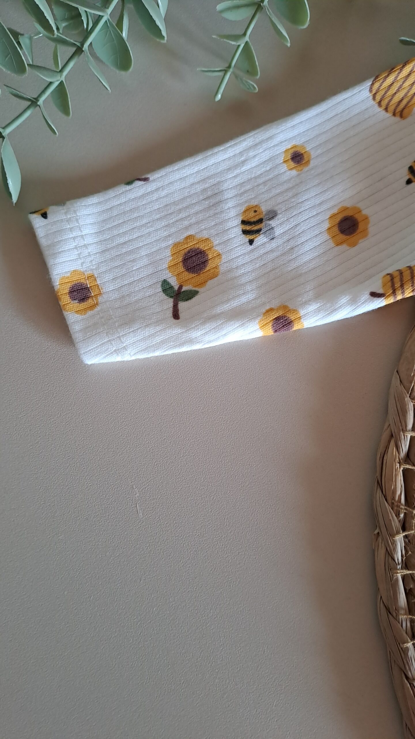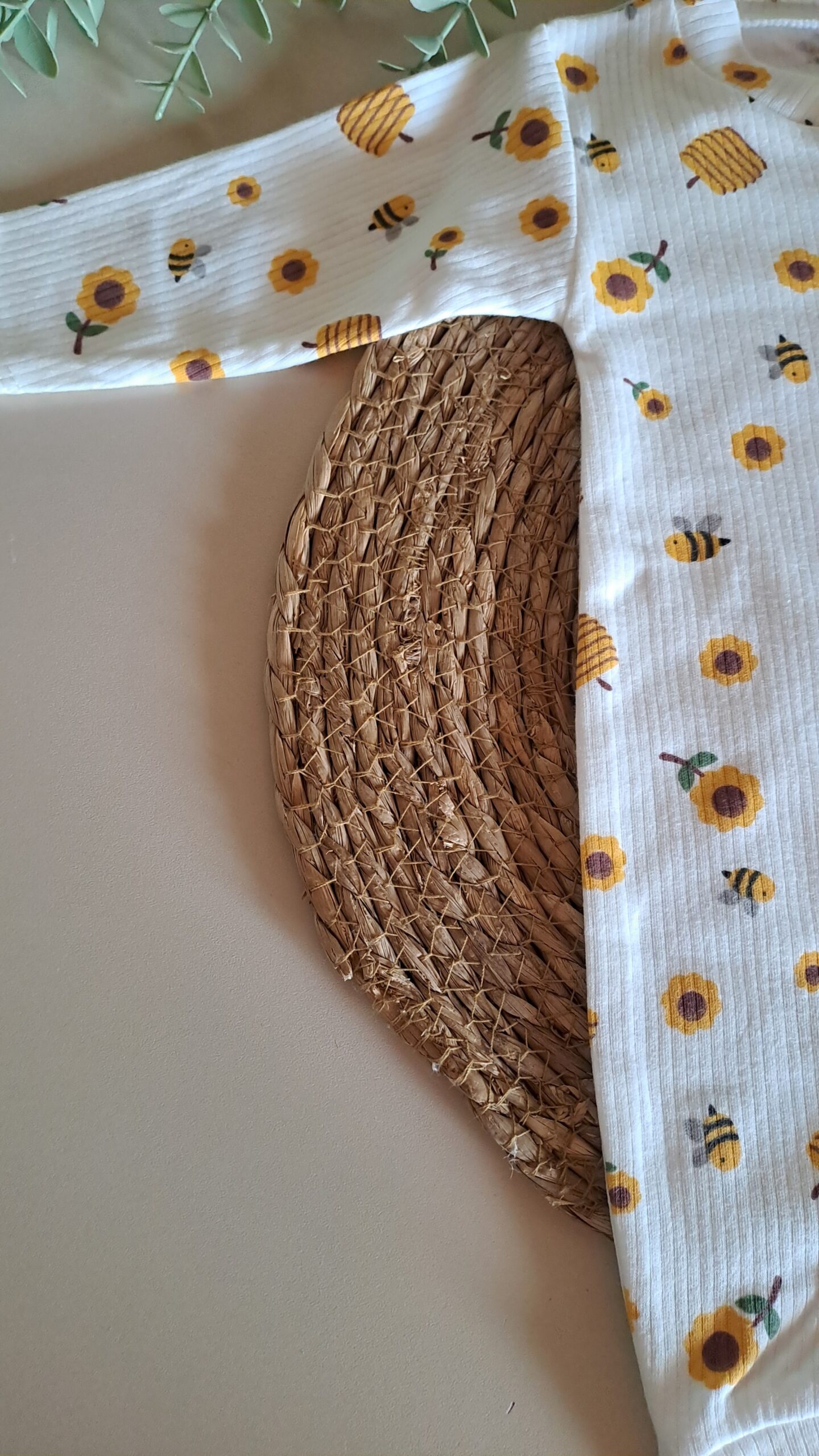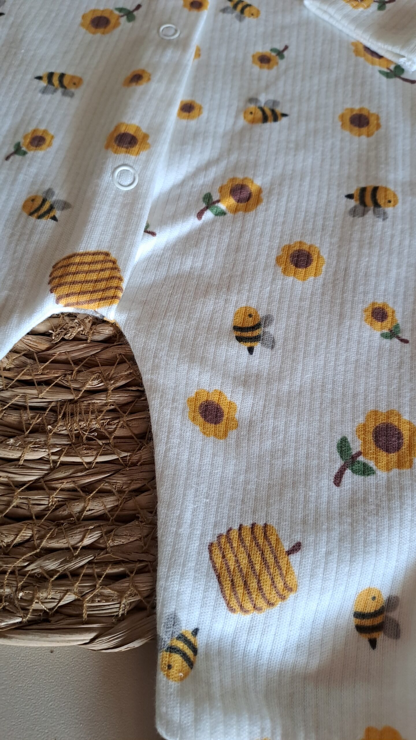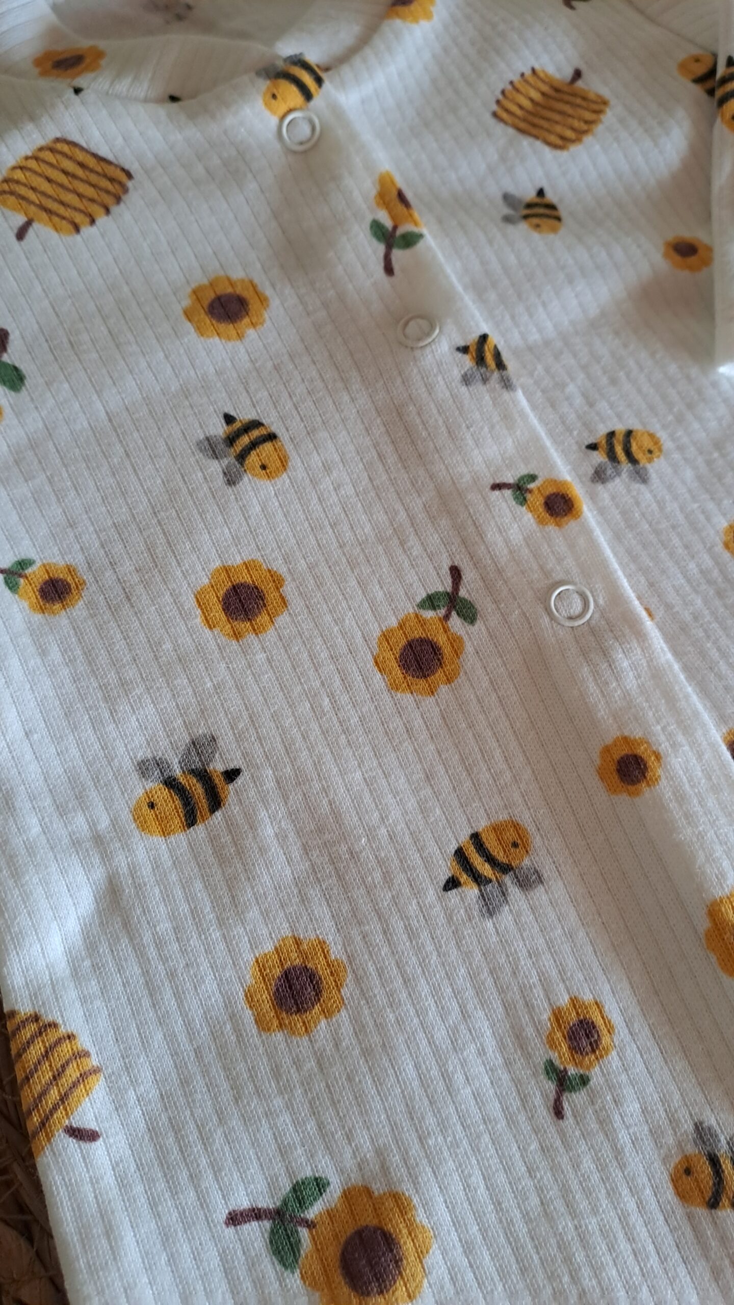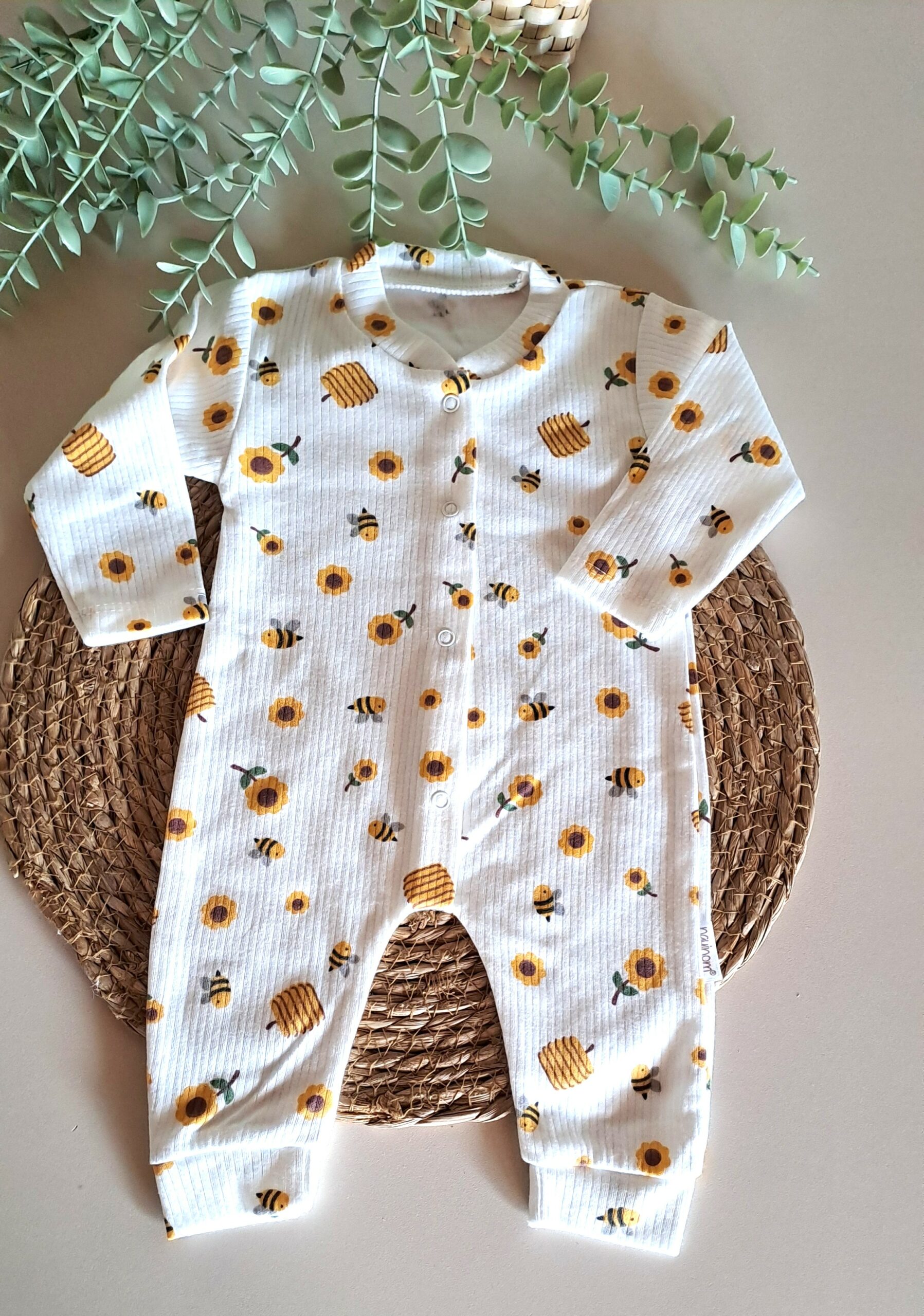 Sevimli arı desenleriyle bezeli bu tulum, pamuklu müslin dokusuyla hem cilde nefes aldırıyor hem de gün boyu hareket özgürlüğü sunuyor. Şıklığı ve doğallığı bir arada arayan anneler için tasarlandı.