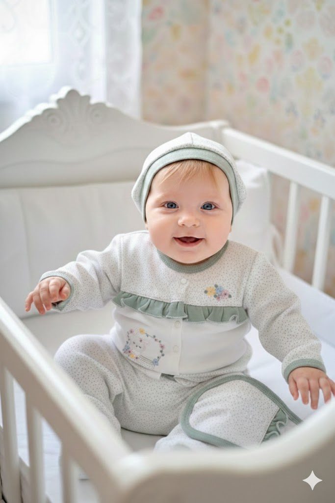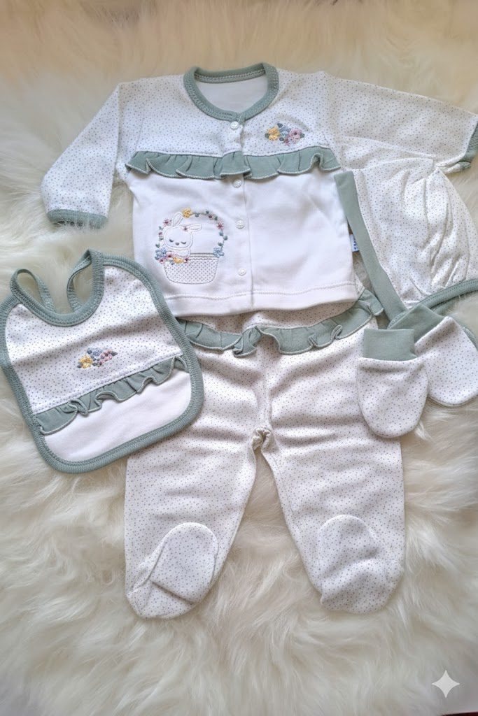 5li zıbın seti 0-3 ay (56 cm) çiçek nakışlı, fırfır detaylı noktalı ;setimiz üst zıbın, patikli pantalon, önlük, eldiven ve bereden oluşmaktadır.0-3 ay kullanımına uygundur. Bebeğinizin zarafetine eşlik edecek bu özel tasarımda, narin fırfır detayları ile el emeği tadındaki nakış işlemeleri bir araya geliyor. Bebeğinizin hassas cildi için en doğal ve en kaliteli seçim. Terletmeyen ve nefes alan pamuklu 1. sınıf kumaştan üretilen bu özel set,yüksek güvenlik standartları ile üstün konforu bir araya getiriyor. retim aşamasında bebeğinizin sağlığına zarar verecek kimyasallar kullanılmamıştır. Ürünün yüksek kalite standartları, dünyanın en prestijli tekstil sertifikalarından biri olan OEKO-TEX Gold belgesiyle tescillenmiştir. Kaşıntı ve alerji yapmaz.