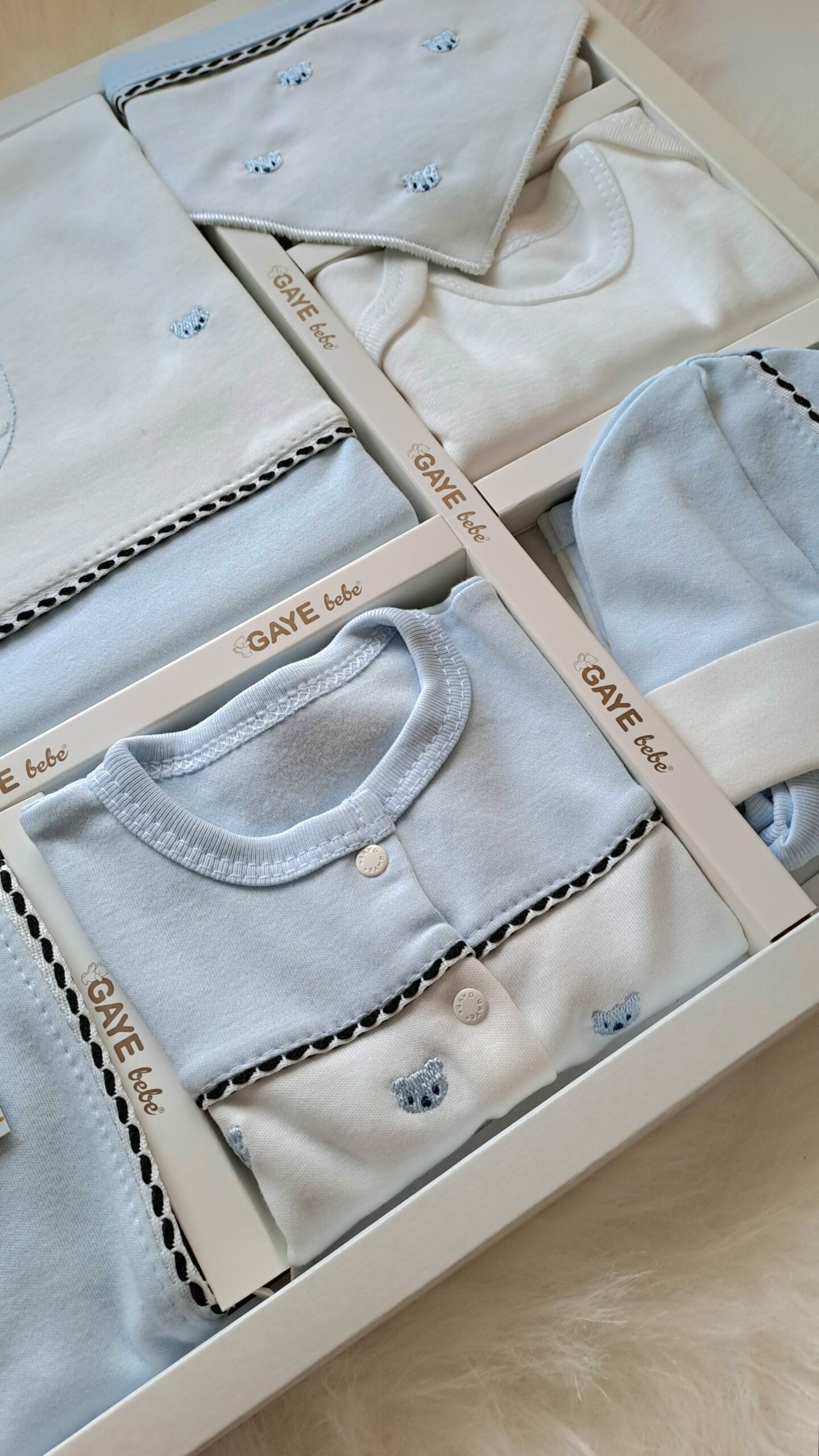 Premium ayıcık kafalı nakışlı Premium setimiz; üst zıbın, patikli pantalon, yelek, battaniye( 3 yaşına kadar kullanılabilir),alttan çıtçıtlı badi, bere ,iç zıbın, fular mama önlüğü ve eldivenden oluşmaktadır. Mavi ve beyazın ferahlığını sevimli detaylarla birleştiren bu set, minik prenseslerin ilk günlerine neşe katmak için tasarlandı. Setimiz fular mama önlüğüyle modern bir tarz yakalarken bebeğinizin kıyafetlerini şık bir aksesuar olarak da tamamlıyor. Bebek sağlığını yüksek kalite standartlarıyla buluşturan Masal Bebek, en değerli varlıklarınız için güvenli ve nitelikli ürünler sunar