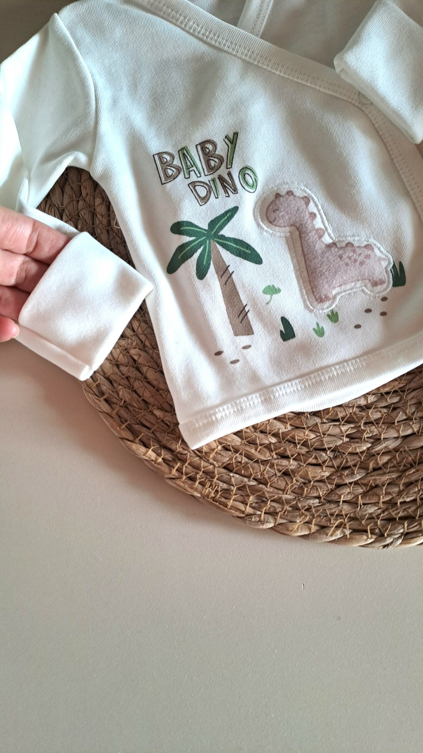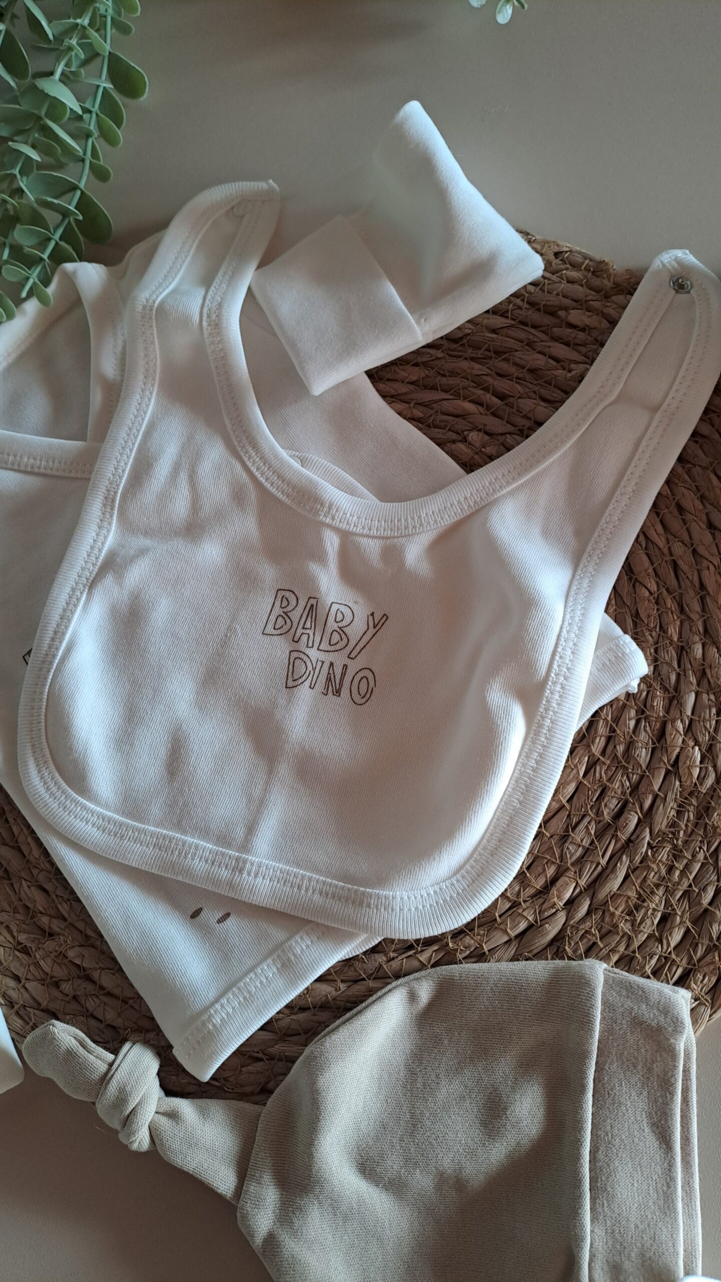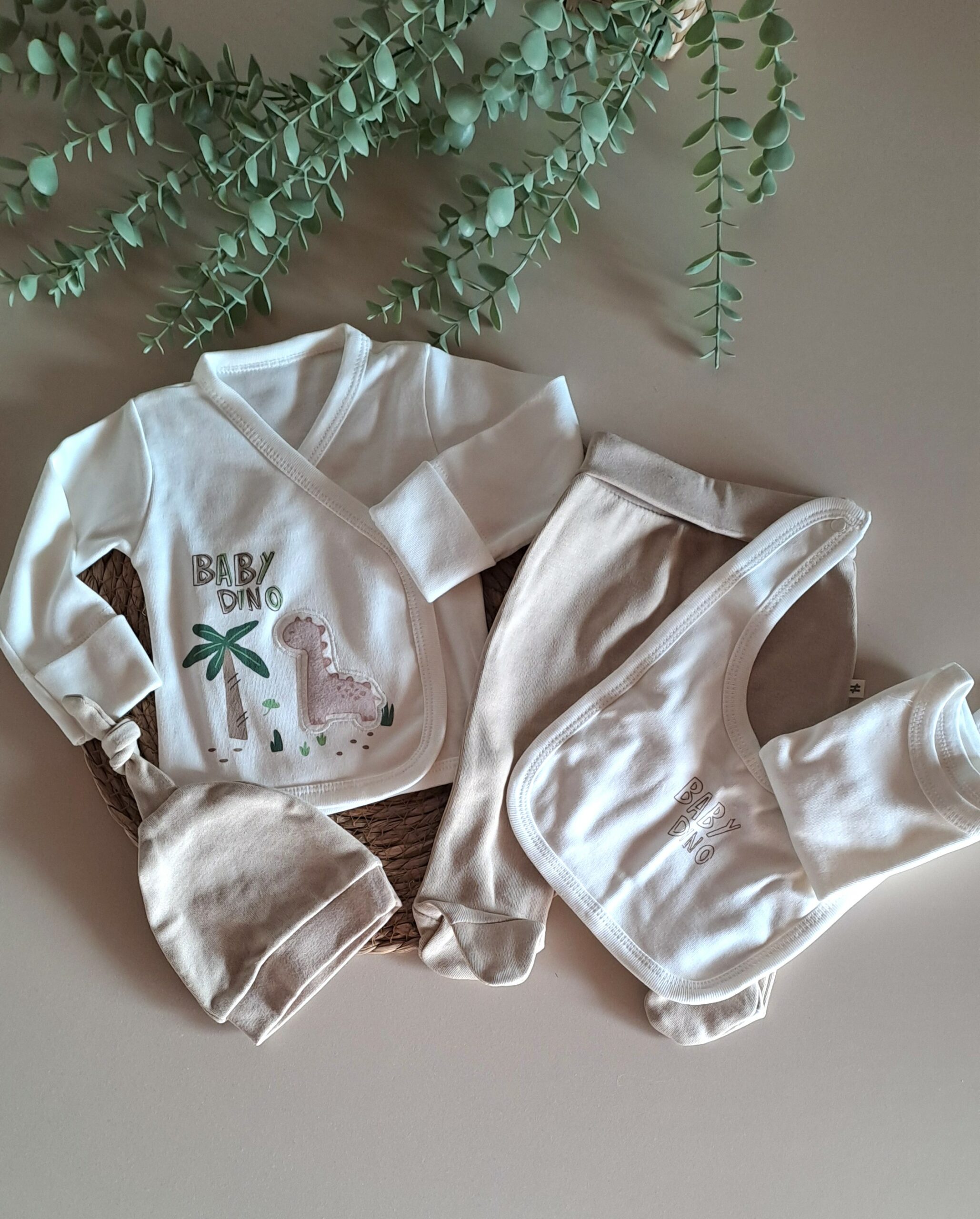 İçerisinde üst zıbın, patikli pantalon, çıtçıtlı mama önlüğü, kısa kollu alttan çıtçıtlı badi ve bağlamalı bereden oluşmaktadır. 0-3 ay (56-62 cm) kullanımına uygundur, unisex modeldir. Bebeğinizin hassas cildi için en doğal ve en kaliteli seçim. Set, sade ve modern tasarımlı çizgilere sahiptir. Güvenlik standartları ile üstün konforu bir araya getiriyor. Üretim aşamasında bebeğinizin sağlığına zarar verecek kimyasallar kullanılmamıştır. Ürünün yüksek kalite standartları, dünyanın en prestijli tekstil sertifikalarından biri olan OEKO-TEX Gold belgesiyle tescillenmiştir.30 derecede yıkayınız.