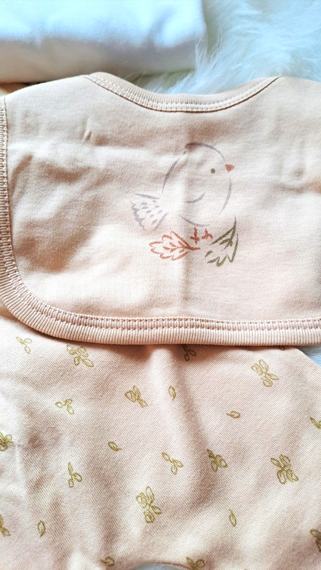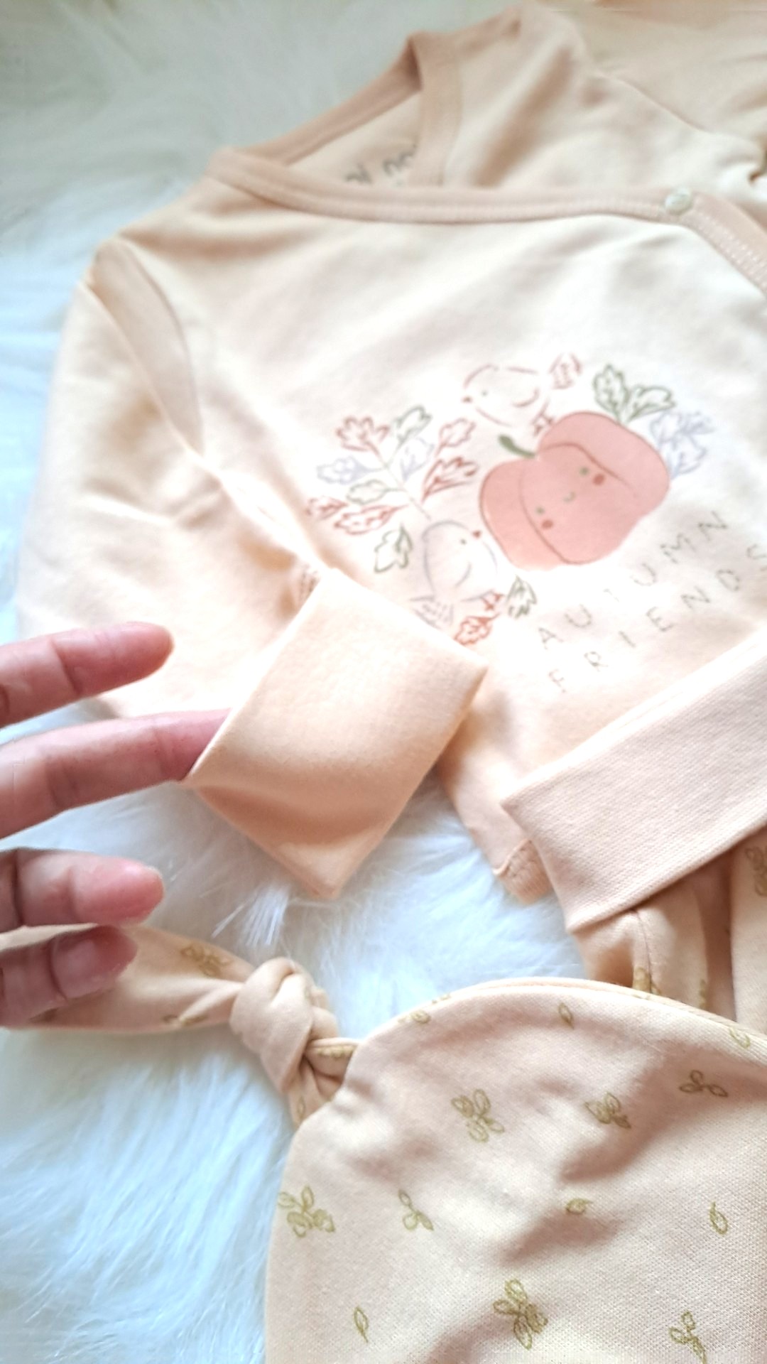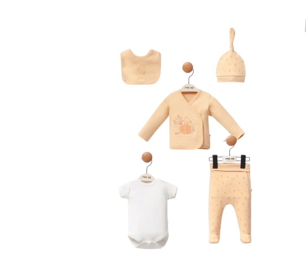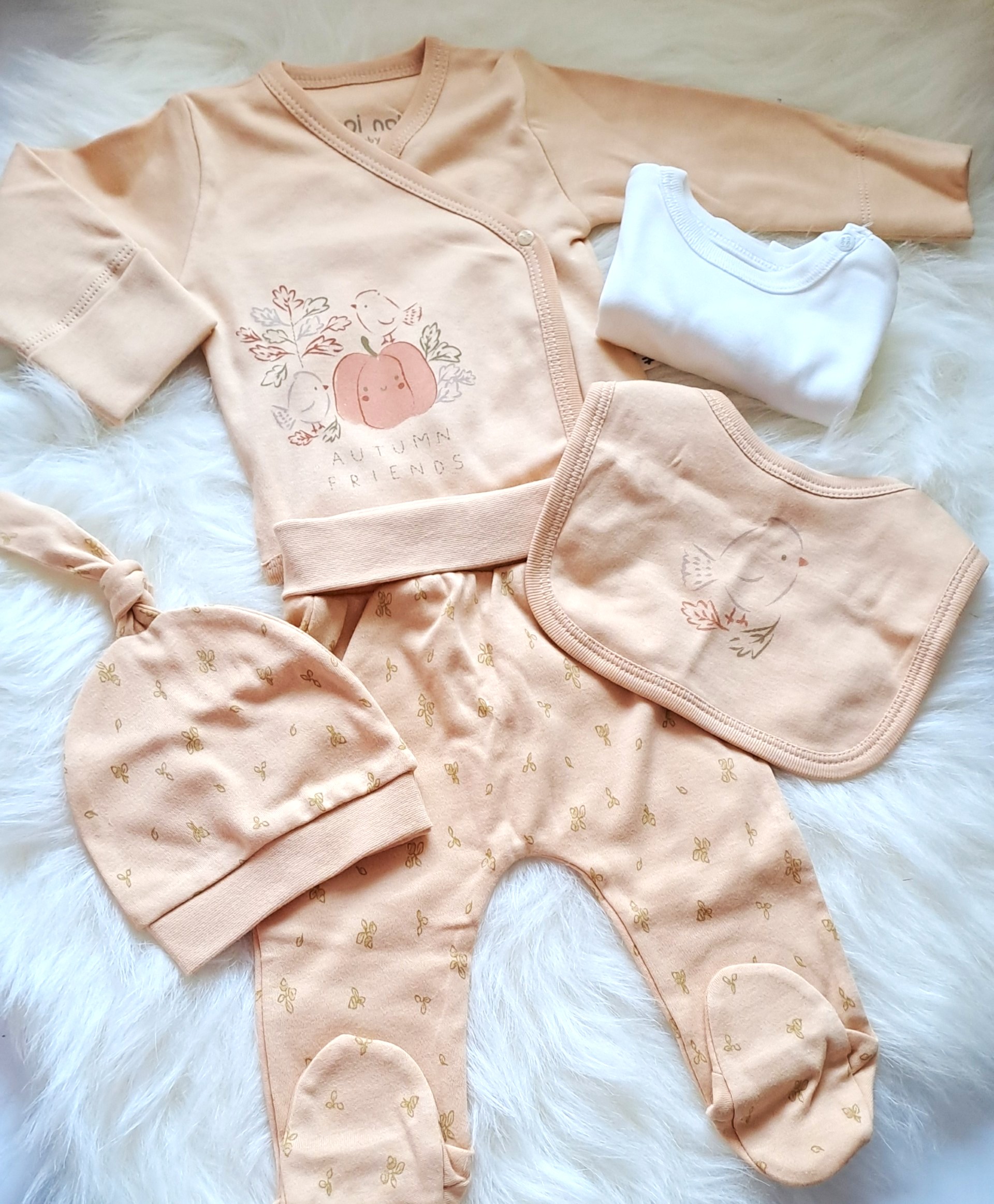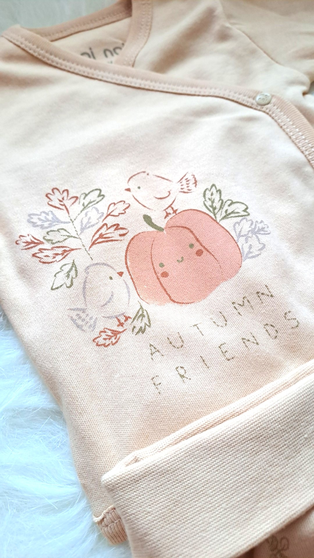 Önden kruvaze kuş detaylı balkabaklı sonbahar tasarımlı bağlamalı bere detaylı setimizin içerisinde; üst zıbın, patikli pantalon, çıtçıtlı mama önlüğü, kısa kollu alttan çıtçıtlı badi ve bağlamalı bere bulunuyor, kendinden eldivenli ve unisex modeldir.5li zıbın seti 0-3 ay (56-62 cm) kullanımına uygundur.