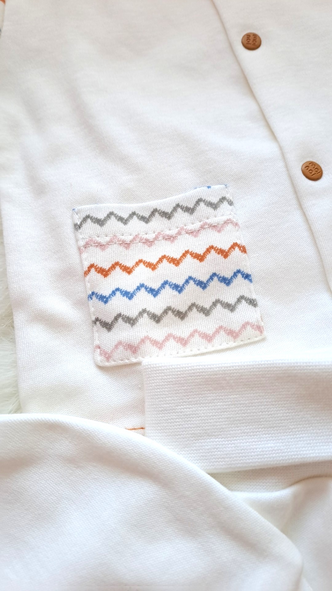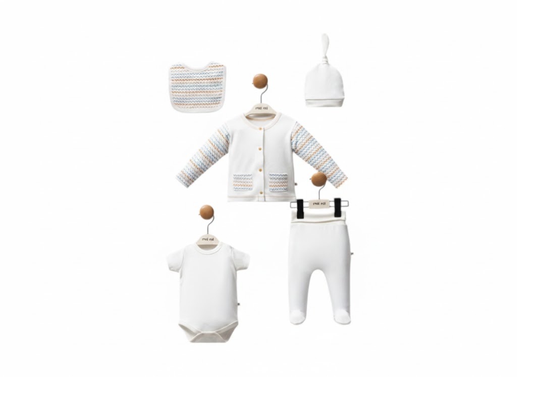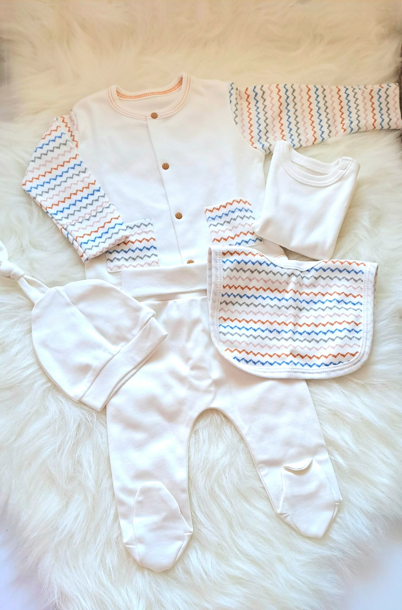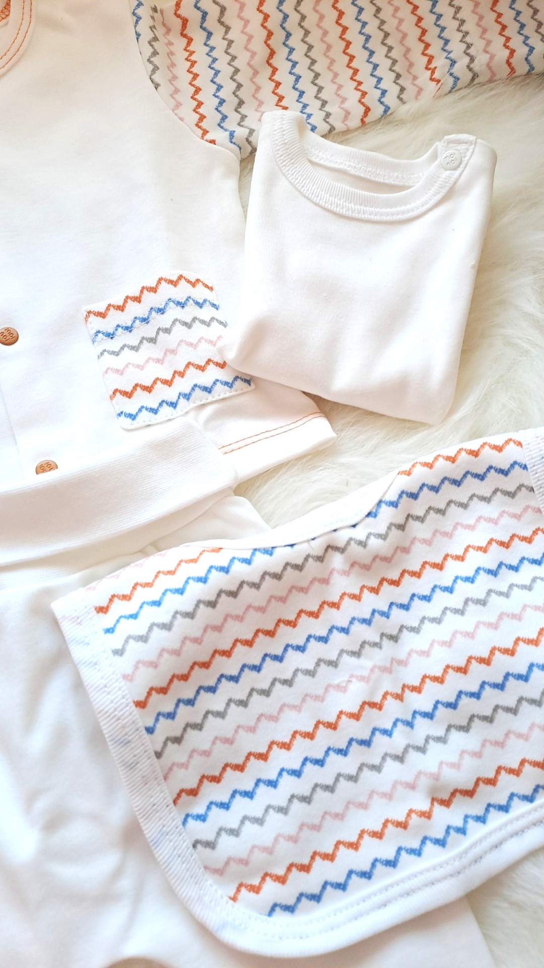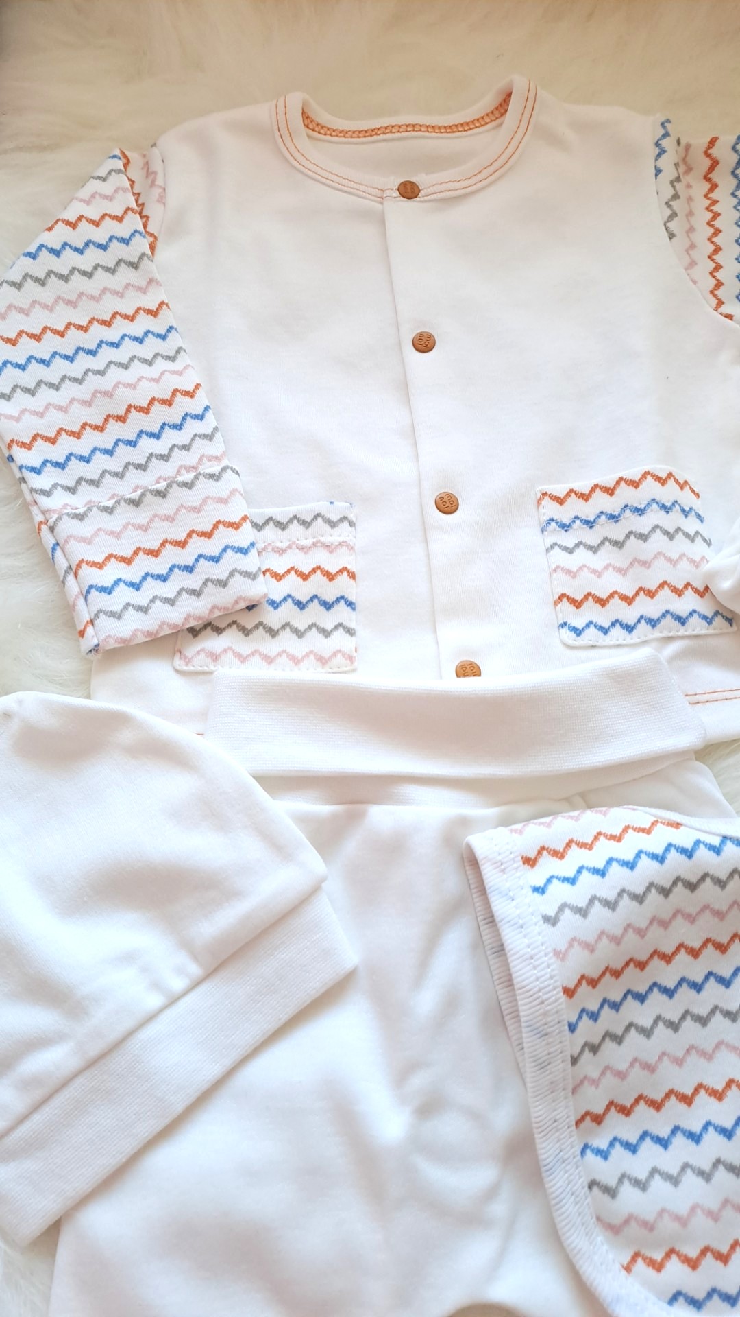 Önden çıtçıtlı cep detaylı renkli zikzak desenleri olan setimizin içerisinde; üst zıbın, patikli pantalon, çıtçıtlı mama önlüğü, kısa kollu alttan çıtçıtlı badi ve bağlamalı bere bulunuyor, kendinden eldivenli ve unisex modeldir. 5li zıbın seti 0-3 ay (56-62 cm) kullanımına uygundur.
