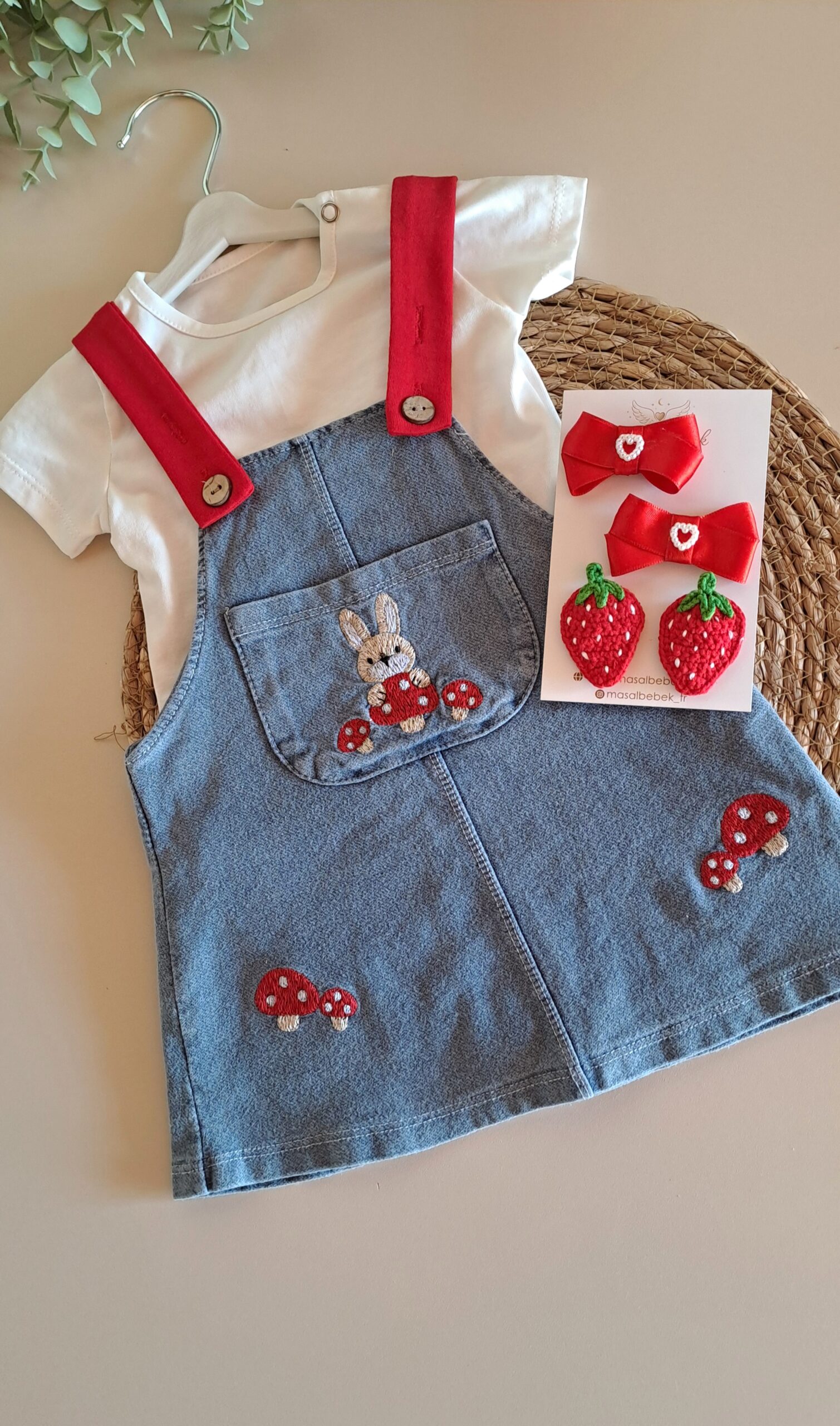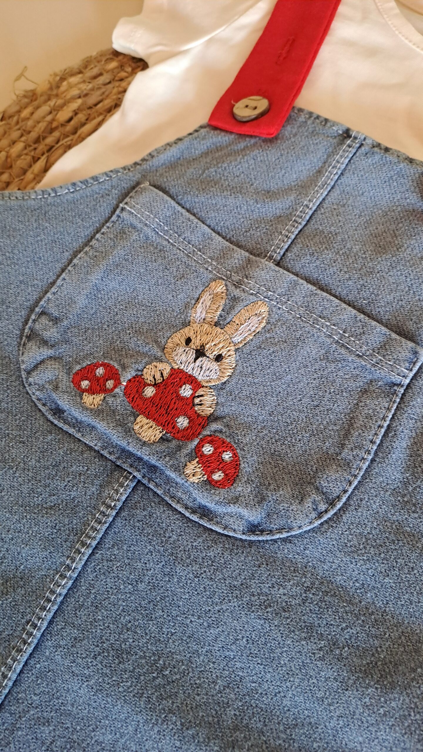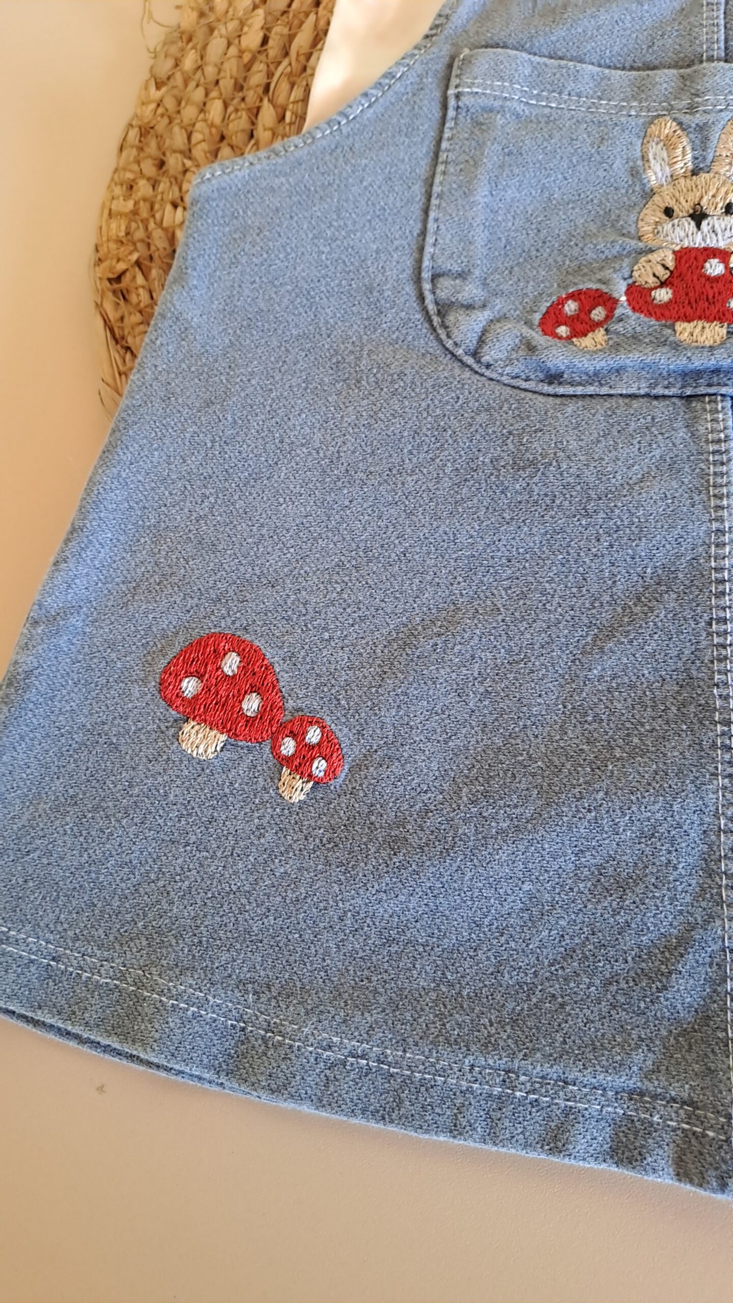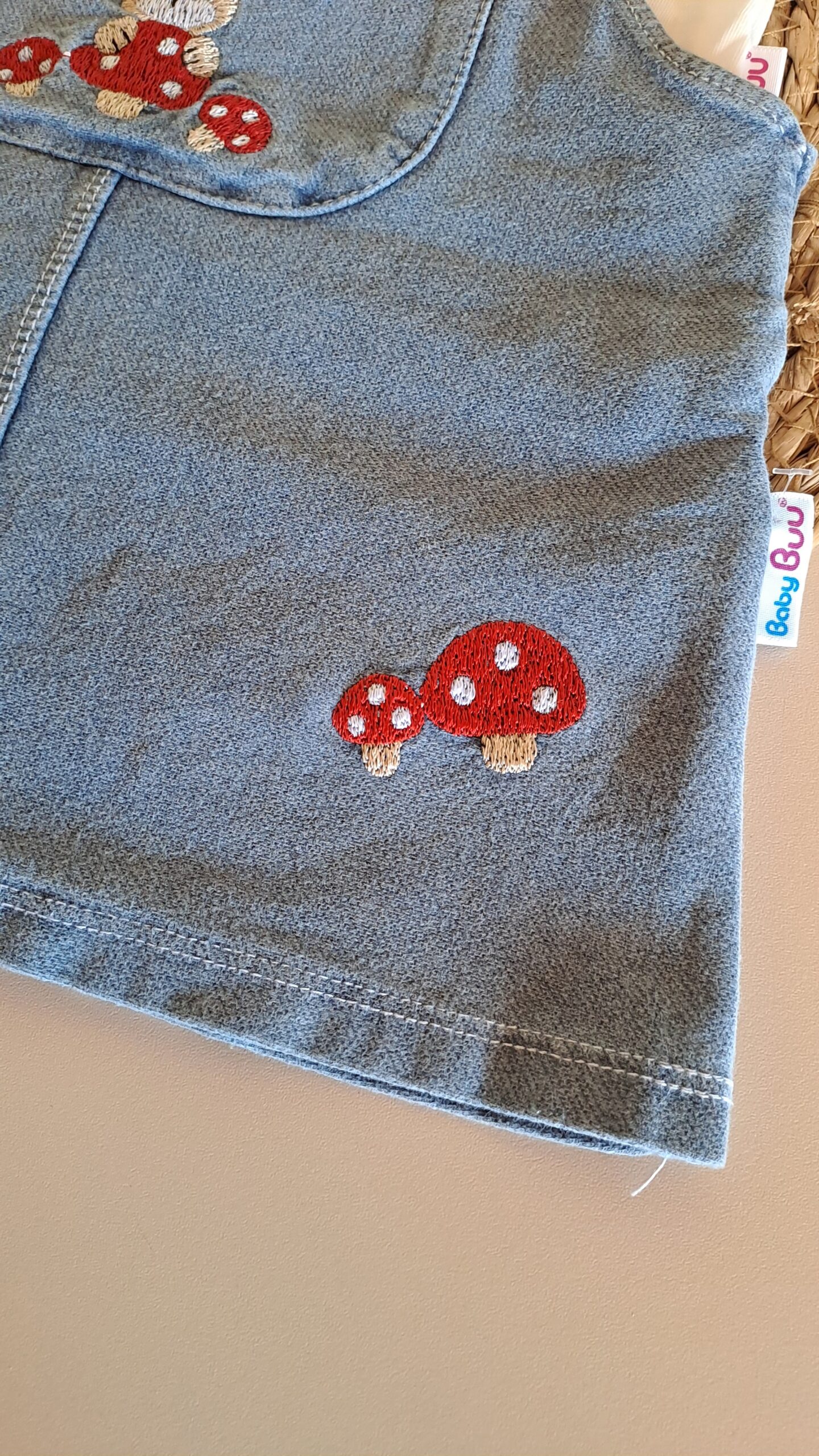 Badili Mantar Nakışlı Ayarlanabilir Kot Salopet Elbise