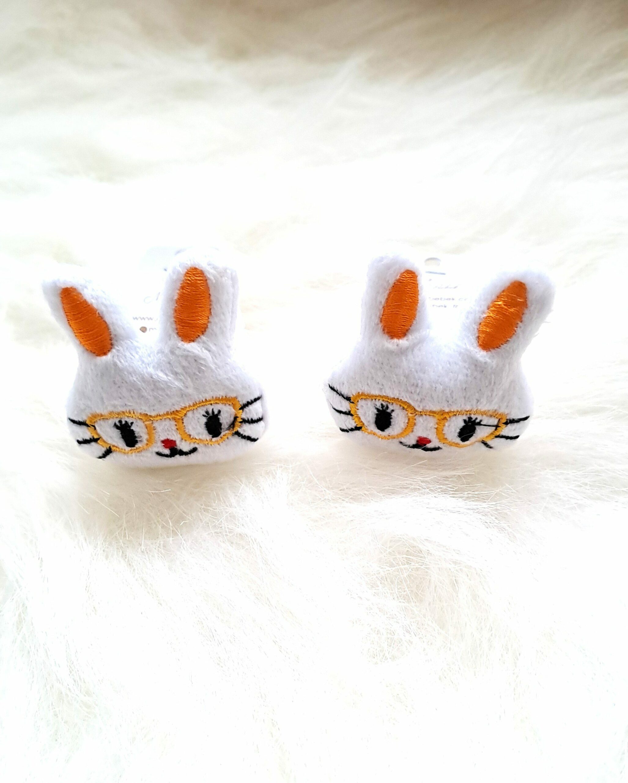 Tasarım: Gözlüklü, gülen yüzlü ve sevimli kulak detaylarına sahip beyaz tavşan figürleri. Modern ve sevimli bir estetiğe sahip.