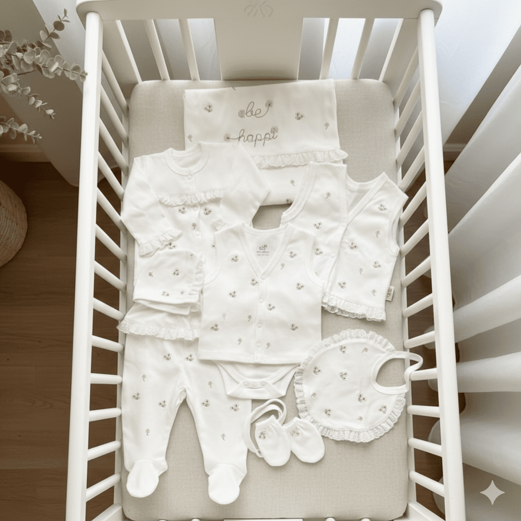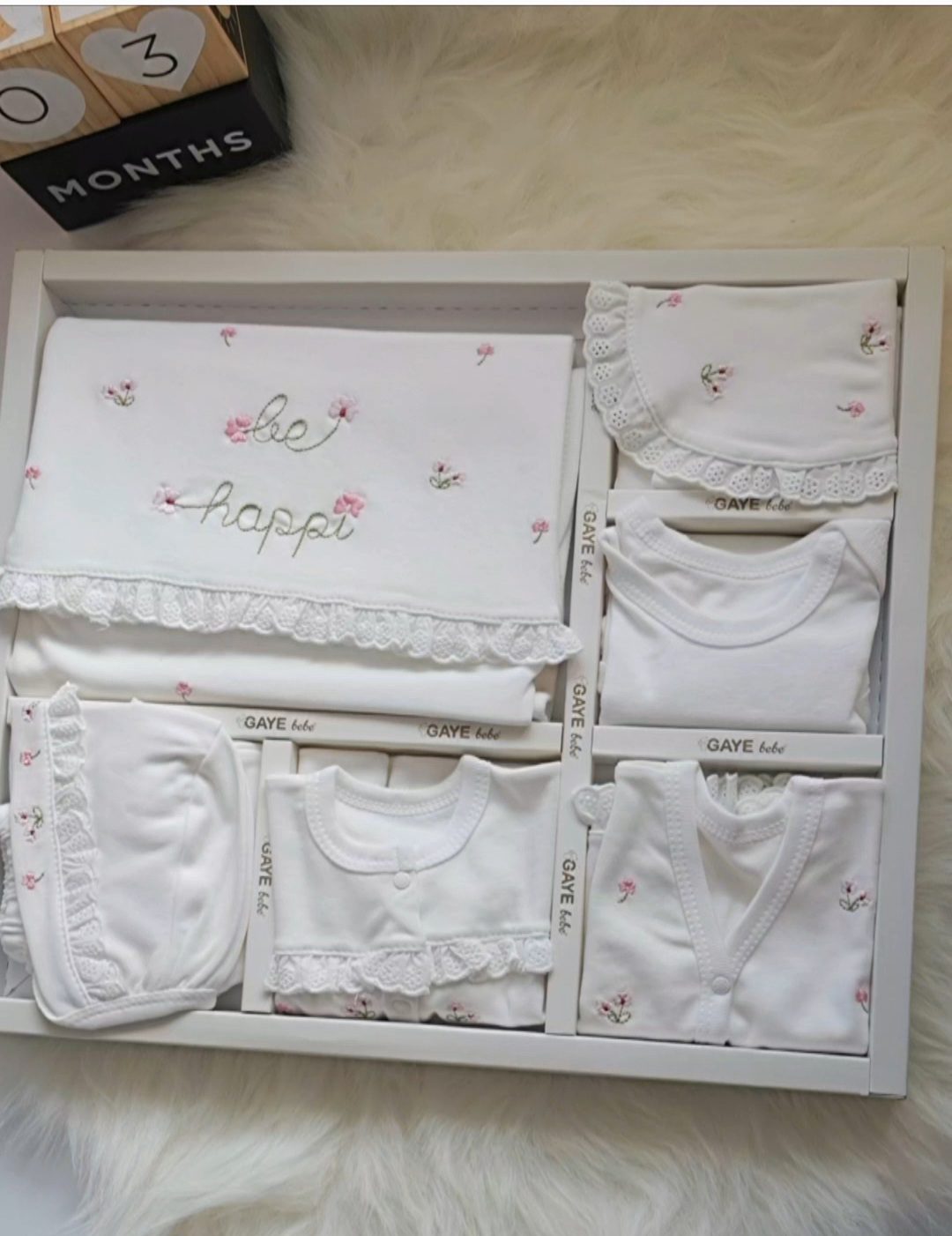 Beyazın saflığını pembe çiçeklerin enerjisiyle birleştiren bu set, minik prensesiniz adına mutlu bir başlangıç sunacaktır. Üzerindeki “be happy” işlemesi, minik çiçek nakışları ve fisto detaylarıyla vintage bir şıklık sunuyor. Yumuşacık dokusuyla bebeğinizin hassas tenini saracak bu set estetik ve konforu bir arada sunuyor. Bebek çeyizlerinin vazgeçilmez klasik yumuşaklığı, bebeğinizin hassas cildi için tasarlanmıştır. Terletmeyen ve nefes alan %100 pamuklu 1. sınıf kumaştan üretilmiştir.