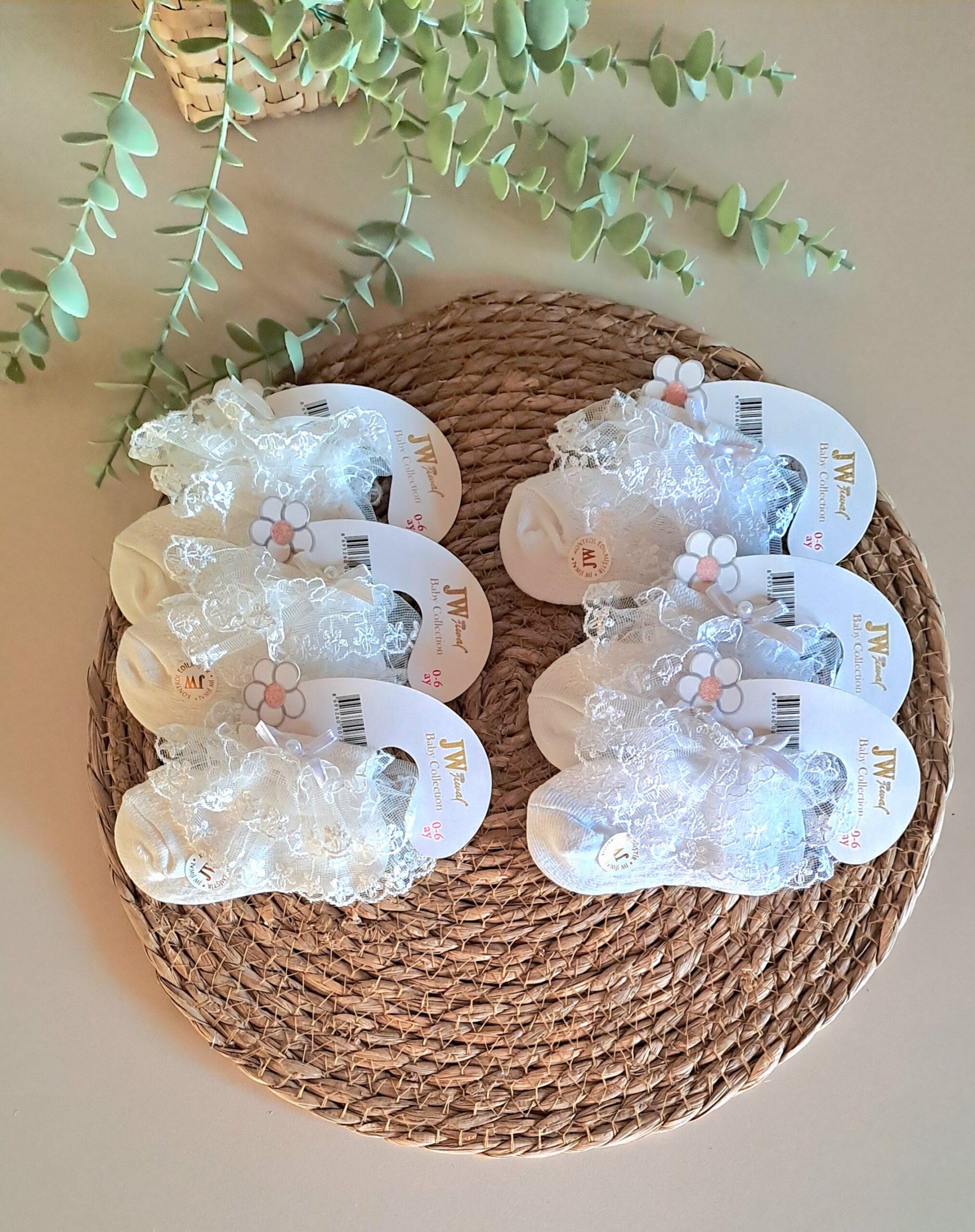 Bebeğinizin en özel günlerinde veya günlük şıklığında ayakkabılarını tamamlayacak en zarif dokunuş. Yumuşacık pamuksu dokusu ve bileğindeki nostaljik dantel işlemesiyle bu çoraplar, her adımı bir masal karesine dönüştürüyor.