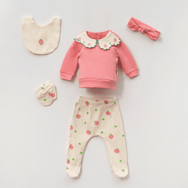 5li zıbın seti 0-3 ay çilek yaka detaylı saç bantlı set 62 cm; setimiz üst zıbın, patikli pantalon, önlük, ve fiyonklu saç bandından oluşmaktadır. Panduf görsel amaçlı eklenmiştir. Dilerseniz renkli panduflarımızla kombin yapabilirsiniz.