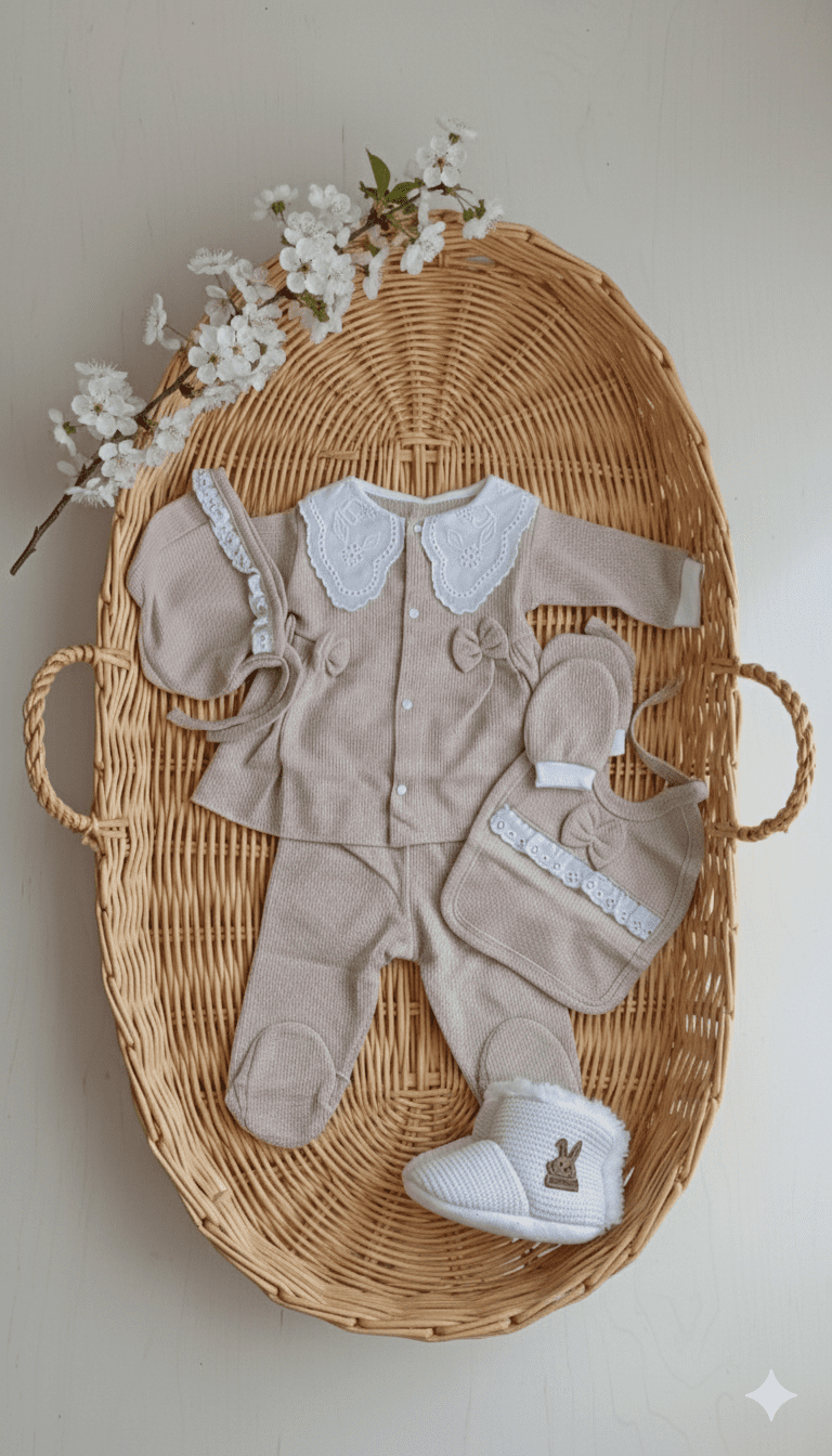 5li zıbın seti 0-3 ay fisto yakalı, fiyonk detaylı waffle kumaş; setimiz üst zıbın, patikli pantalon, önlük, eldiven ve bereden oluşmaktadır. Bebeğinizin hassas cildi için en doğal ve en şık seçim. Zarif fisto aksesuarları ve fiyonk detayıyla tasarıma zamansız, nostaljik bir zarafet katıyor. Terletmeyen ve nefes alan %100 pamuklu 1. sınıf kumaştan üretilmiştir. Üretim aşamasında bebeğinizin sağlığına zarar verecek kimyasallar kullanılmamıştır. Üründe azo boya kullanılmaz. Kullanılan çıtçıt ve aksesuarların tamamı nikel içermez özelliktedir. Ürünün yüksek kalite standartları, dünyanın en prestijli tekstil sertifikalarından biri olan OEKO-TEX Gold belgesiyle tescillenmiştir. Türkiye’de üretilmiştir. Formunu ve yumuşaklığını koruması için 30 derecede yıkanması tavsiye edilir.