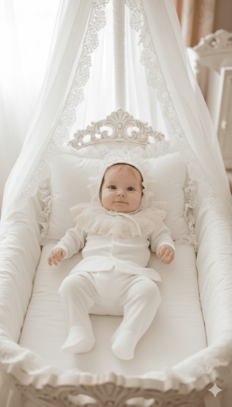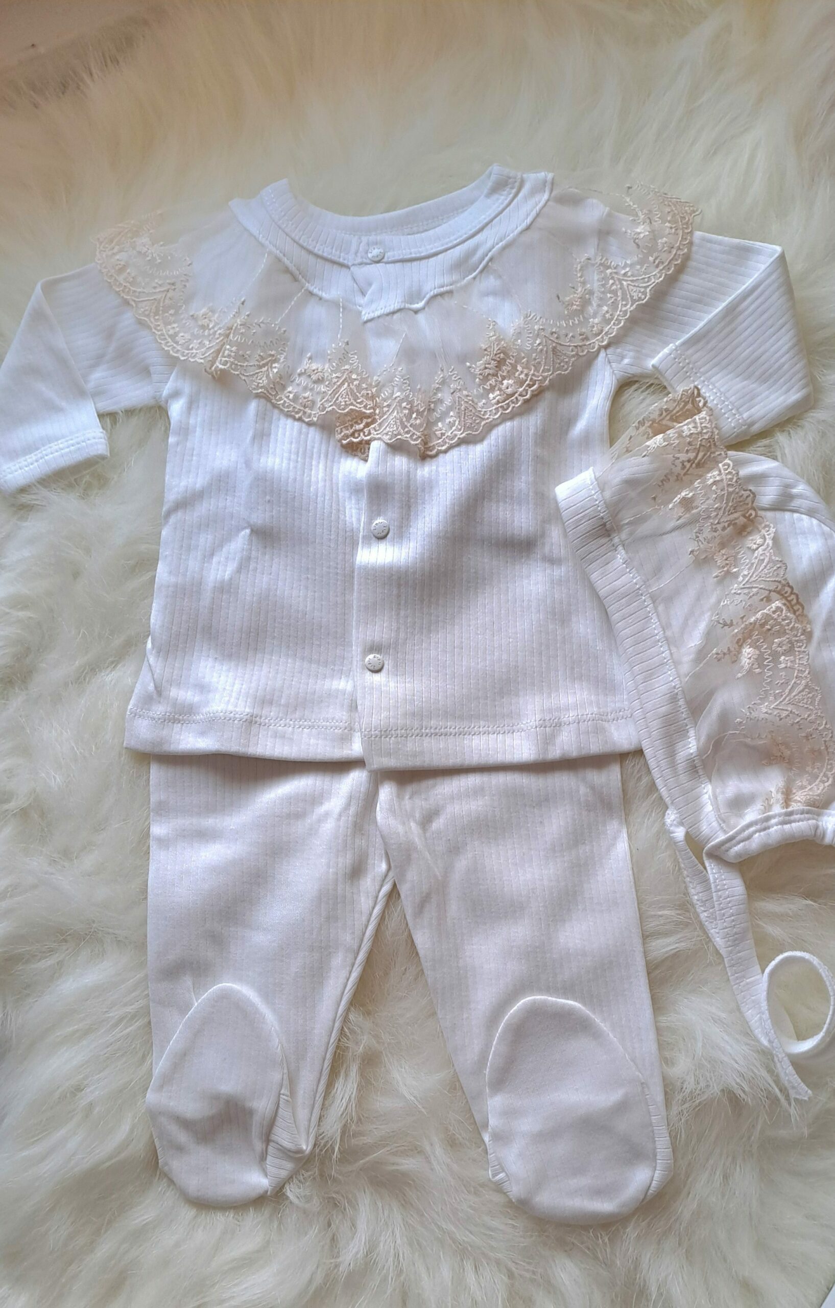 Bebeğinizin en özel anlarına eşlik edecek, zarafet ve konforun kusursuz birleşimiyle tanışın. Klasik fransız esintilerini modern bir dokunuşla birleştiren bu özel takım, yüksek kaliteli, nefes alabilen %100 pamuk dokusuyla bebeğinizin hassas cildini nazikçe sarar. Zarif dantel yakası ve takımı tamamlayan nostaljik başlığı, minik bebeğinize bir masal kahramanı havası katar. Hem özel günlerde, hem fotoğraf çekimlerinde hem de hastane çıkışında tercih edebileceğiniz bu yumuşaklığın en saf hali, bebeğinizin saflığını ve güzelliğini ön plana çıkaracaktır.