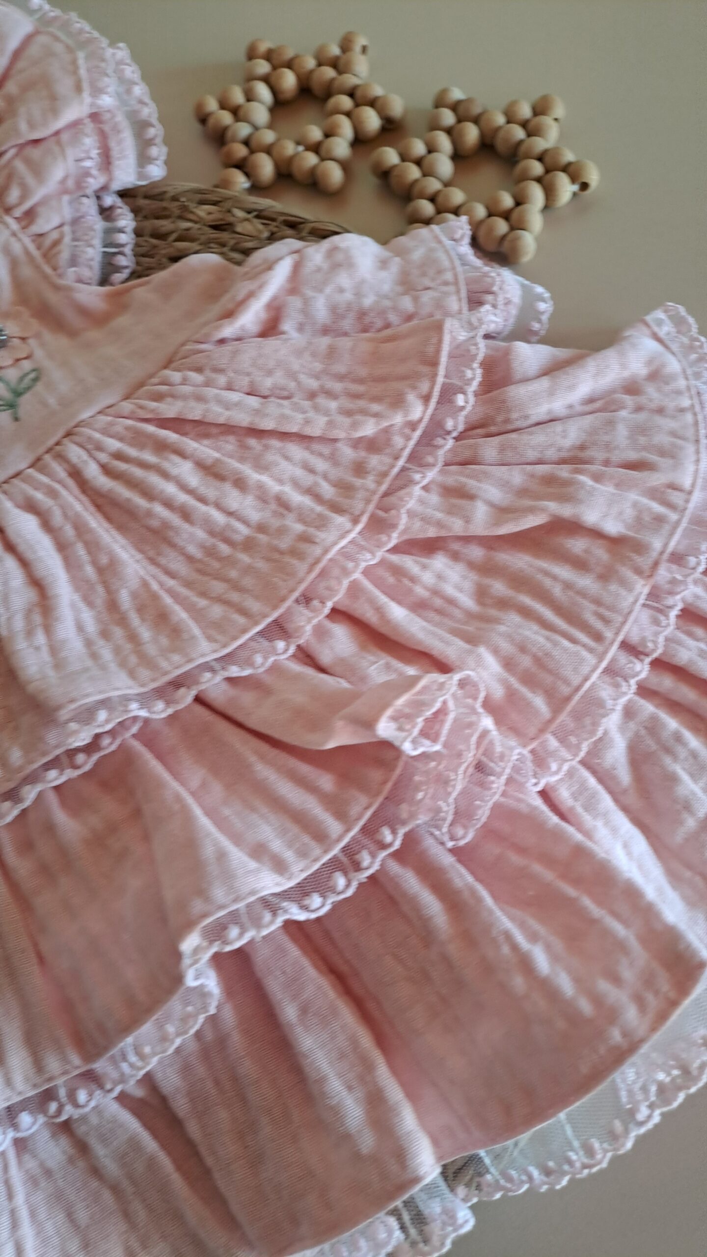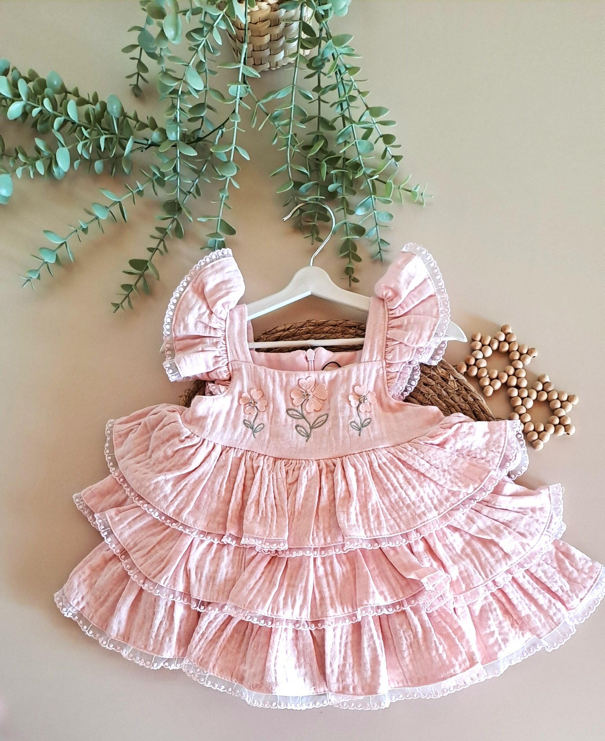 Kız Bebek %100 Pamuk Organik Müslin Pembe Çiçek Fırfırlı Elbise; doğanın saflığını bebeğinizin gardırobuna taşıyın. %100 organik pamuk müslin kumaşın nefes alan hafifliğiyle tasarlanan bu özel elbise, pembe rengin sıcaklığını el emeği hissi veren çiçek nakışlarıyla buluşturuyor. Tamamen doğal pamuk liflerinden üretilen müslin dokusu, yüksek hava sirkülasyonu sağlayarak bebeğinizin gün boyu ferah kalmasına yardımcı olur. Omuzlardaki ve etek ucundaki uçuş uçuş fırfırlar, elbiseye hareketli ve masalsı bir form kazandırır. Tüm kombiniyle özel gün çekimleri için oldukça zarif bir alternatif olacaktır.