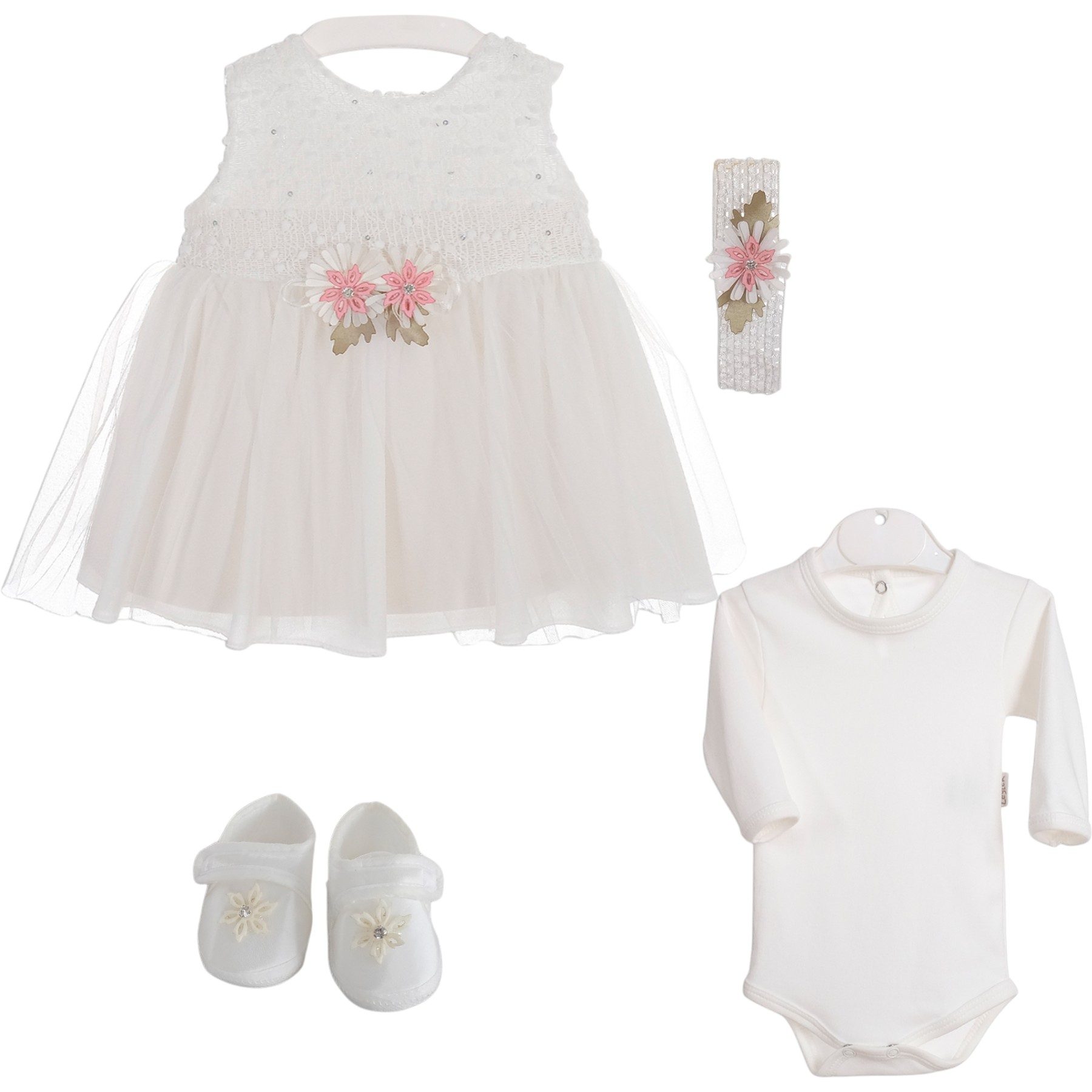 Mevlit Elbisesi, 1 adet saç bantlı tokadan, 1 çift patik ayakkabı, 1 adet alttan çıtçıtlı badi ve elbiseden oluşmaktadır. Mevlit, diş buğdayı, hastane çıkışı, isim töreni ve özel davetlerde güvenle tercih edilecek şık bir kombin tercihidir. Türkiye’de üretilmiştir. Kanserojen ve kimyasal madde içermez.