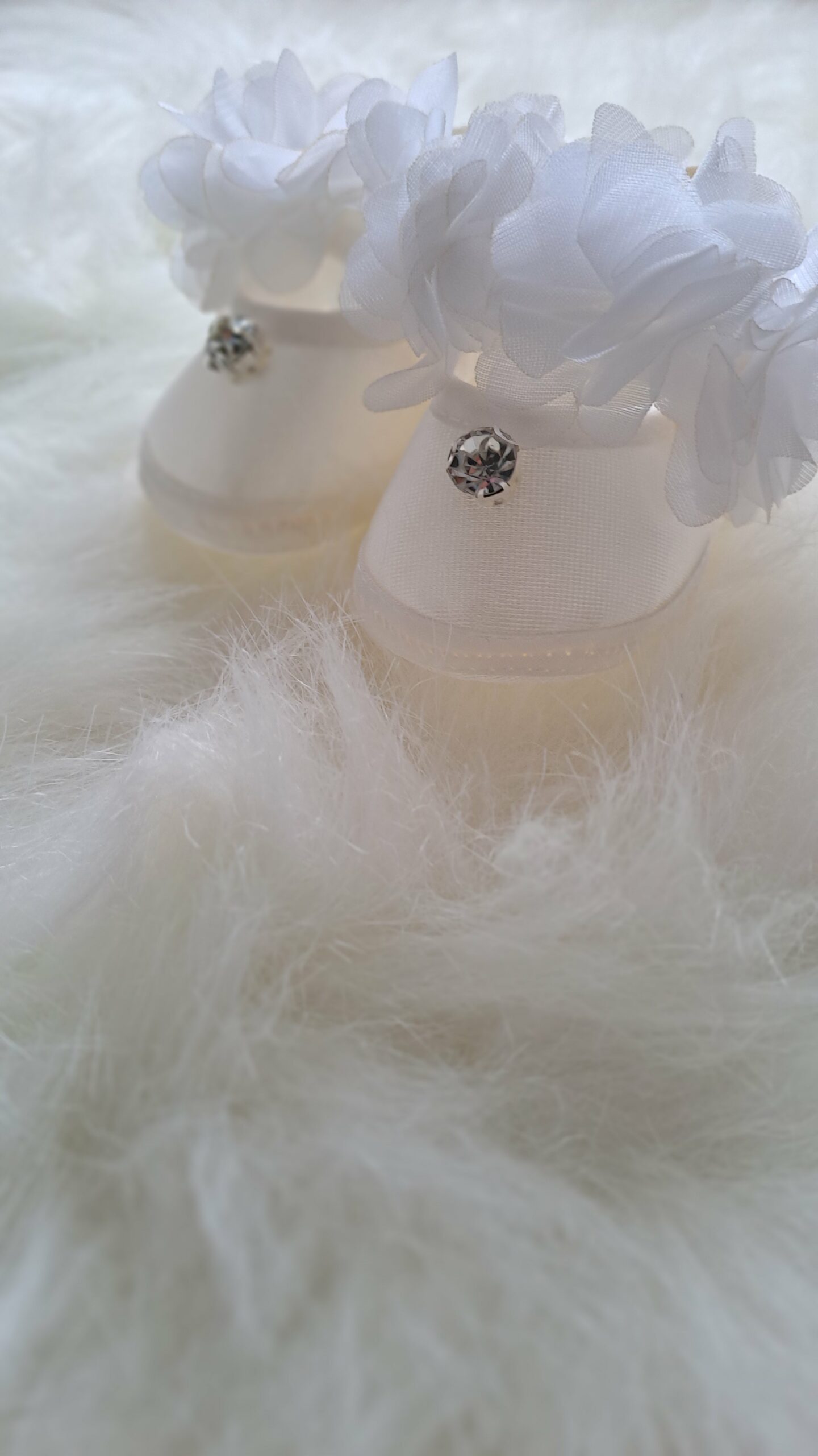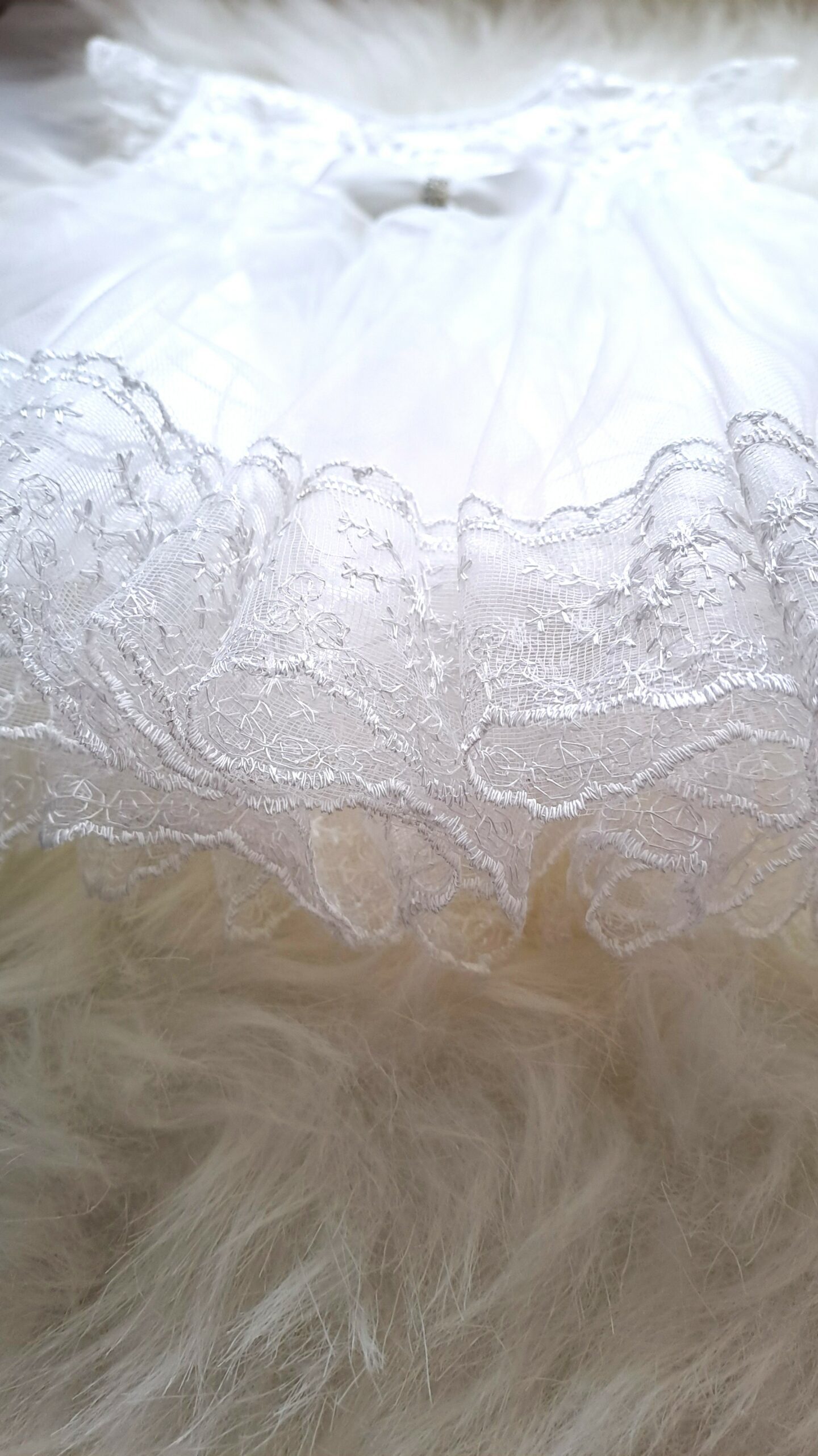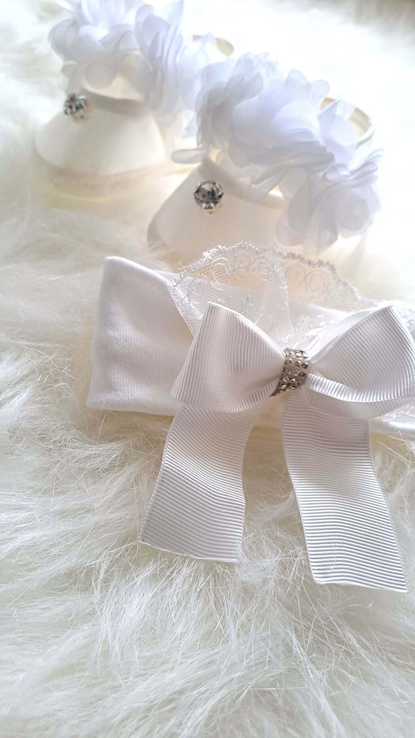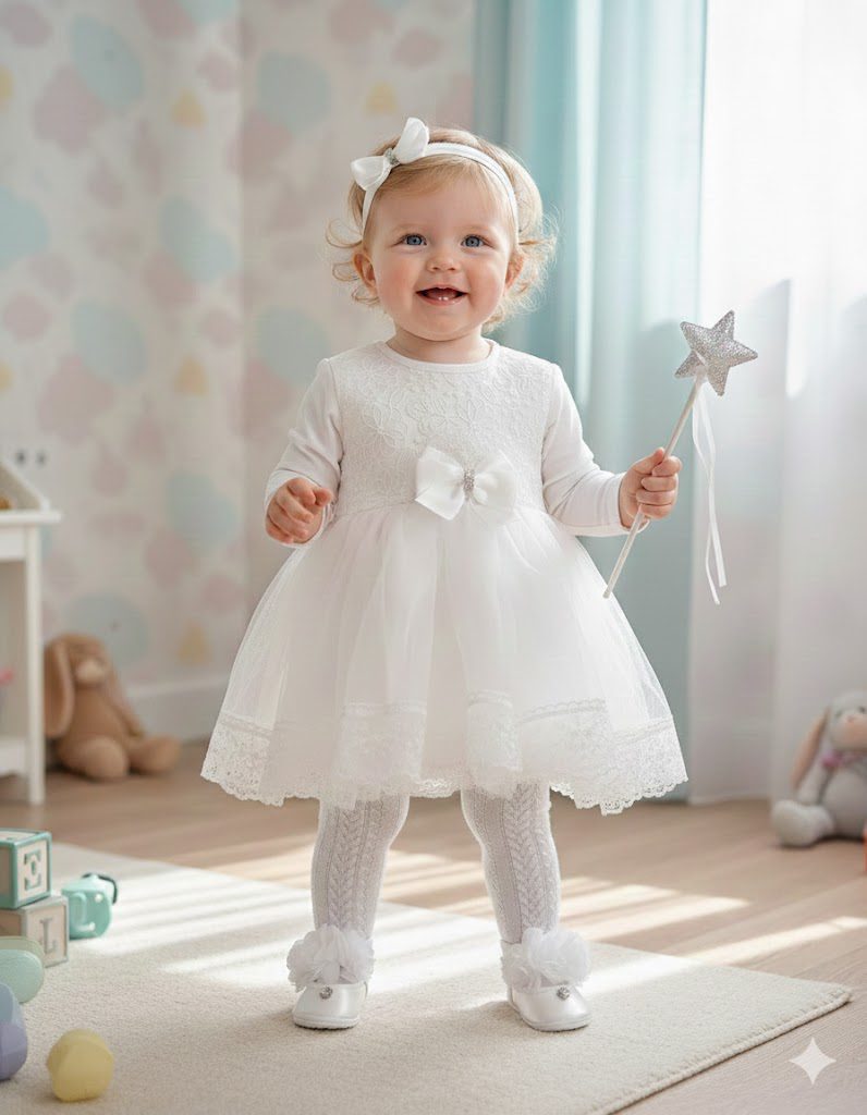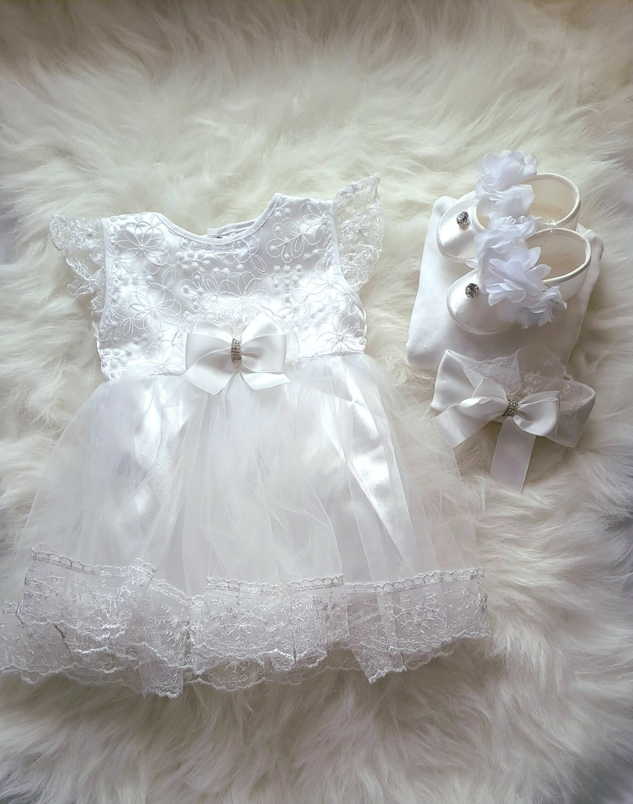 Mevlit Elbisesi eteği güpürlü, parlak taşlı fiyonk detaylı beyaz; elbise, bir çift bebek patiği ve bandana tokasından oluşmaktadır. Beyaz rengin sade şıklığı, güpürlü etek yapısı ve parlak taş süslemeli fiyonk detayıyla birleşerek klasik ve göz alıcı bir görünüm oluşturur.