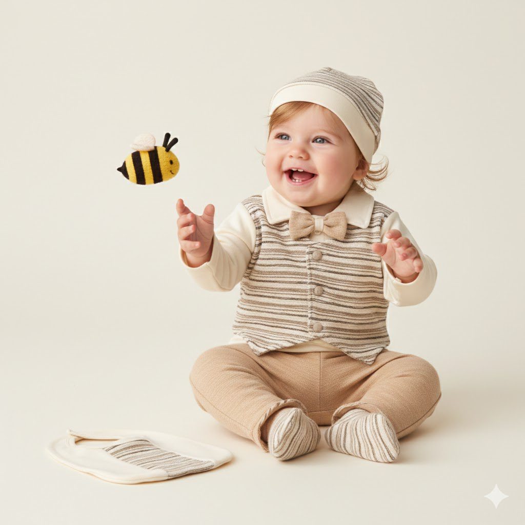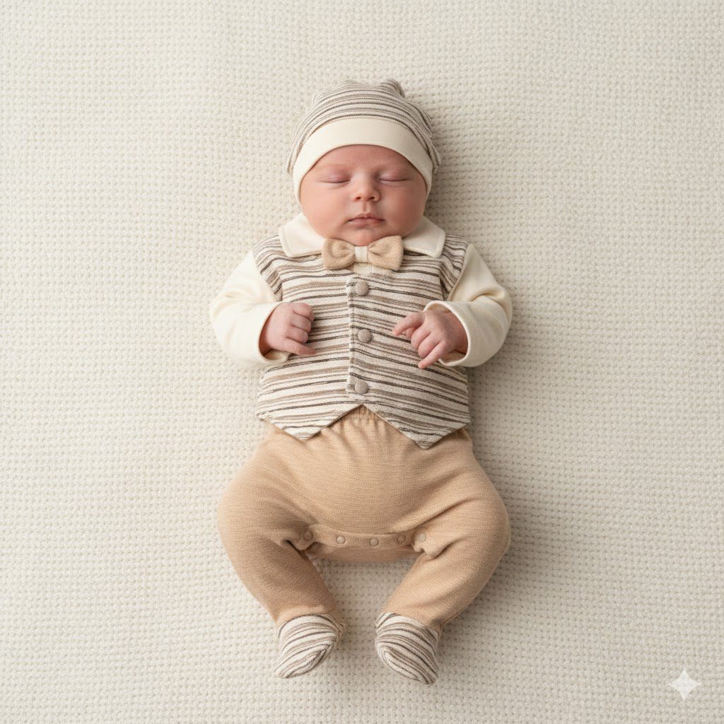5li zıbın seti 0-3 ay (56 cm) önden kumaş kaplamalı düğmesi olan, papyon detaylı, yelekli takım; setimiz yelekli üst zıbın, patikli pantalon, çizgili detaylı önlük ,eldiven ve çizgili bereden oluşmaktadır. Papyon detayıyla düğme kaplamasıyla oldukça şık bir tasarımdır. Özel günlerde ve mevlitlerde de tercih edilebilen bir tasarıma sahiptir. Bebeğinizin hassas cildi için en doğal ve en şık seçim. Terletmeyen ve nefes alan %100 pamuklu 1. sınıf kumaştan üretilmiştir. Bebeğinize özel üretilmiş bu ürün uluslararası üretim ve güvenlik standartlarına sahiptir. Kanserojen madde içermez üretilen ürünler en hassas ciltlerde dahi alerji neden olmaz.30 derece yıkayınız.0-3 ay 56 cm kullanımına uygundur.