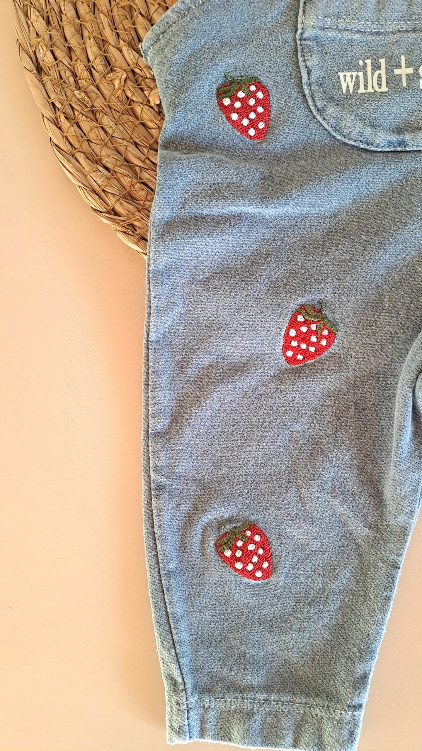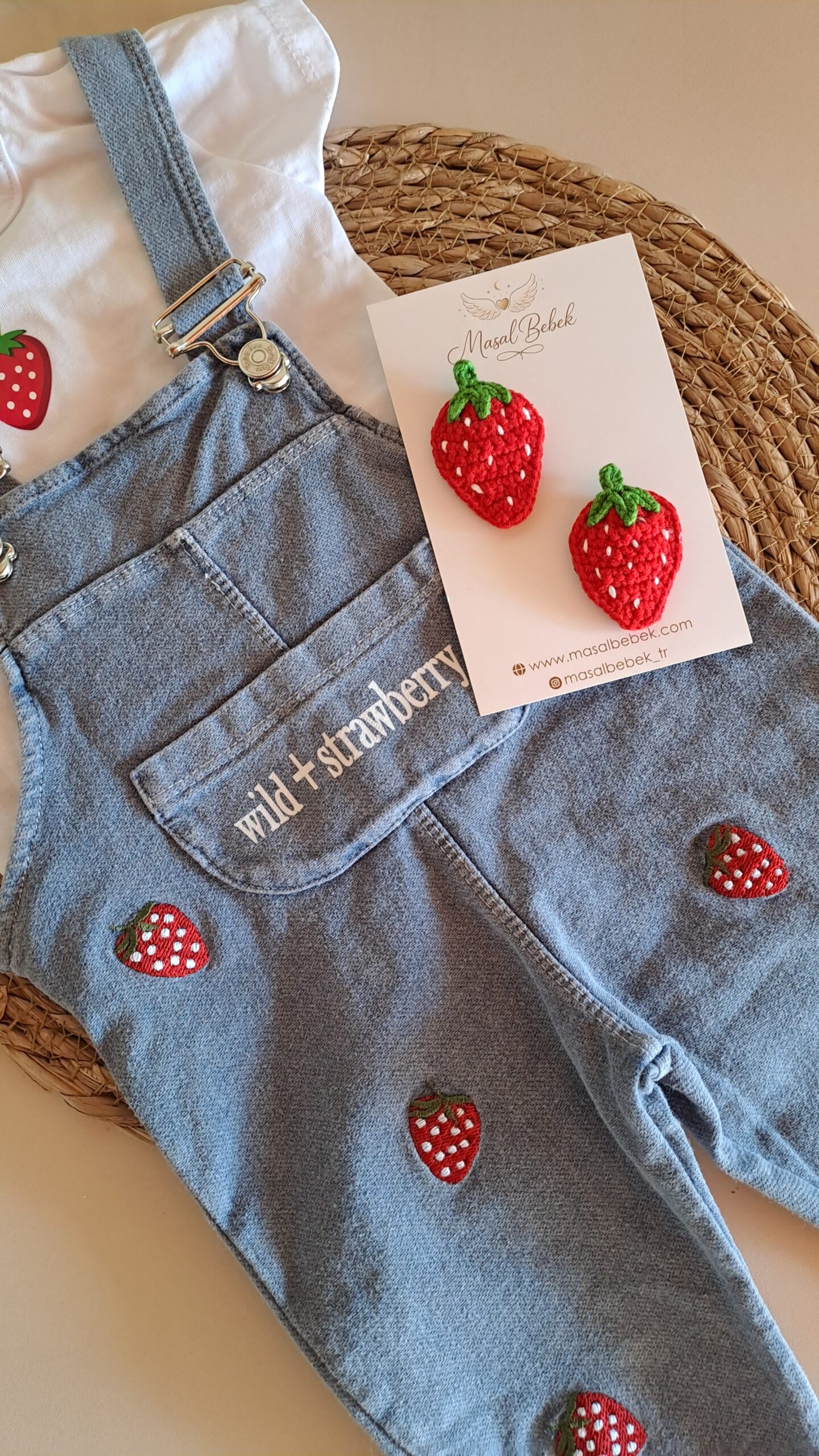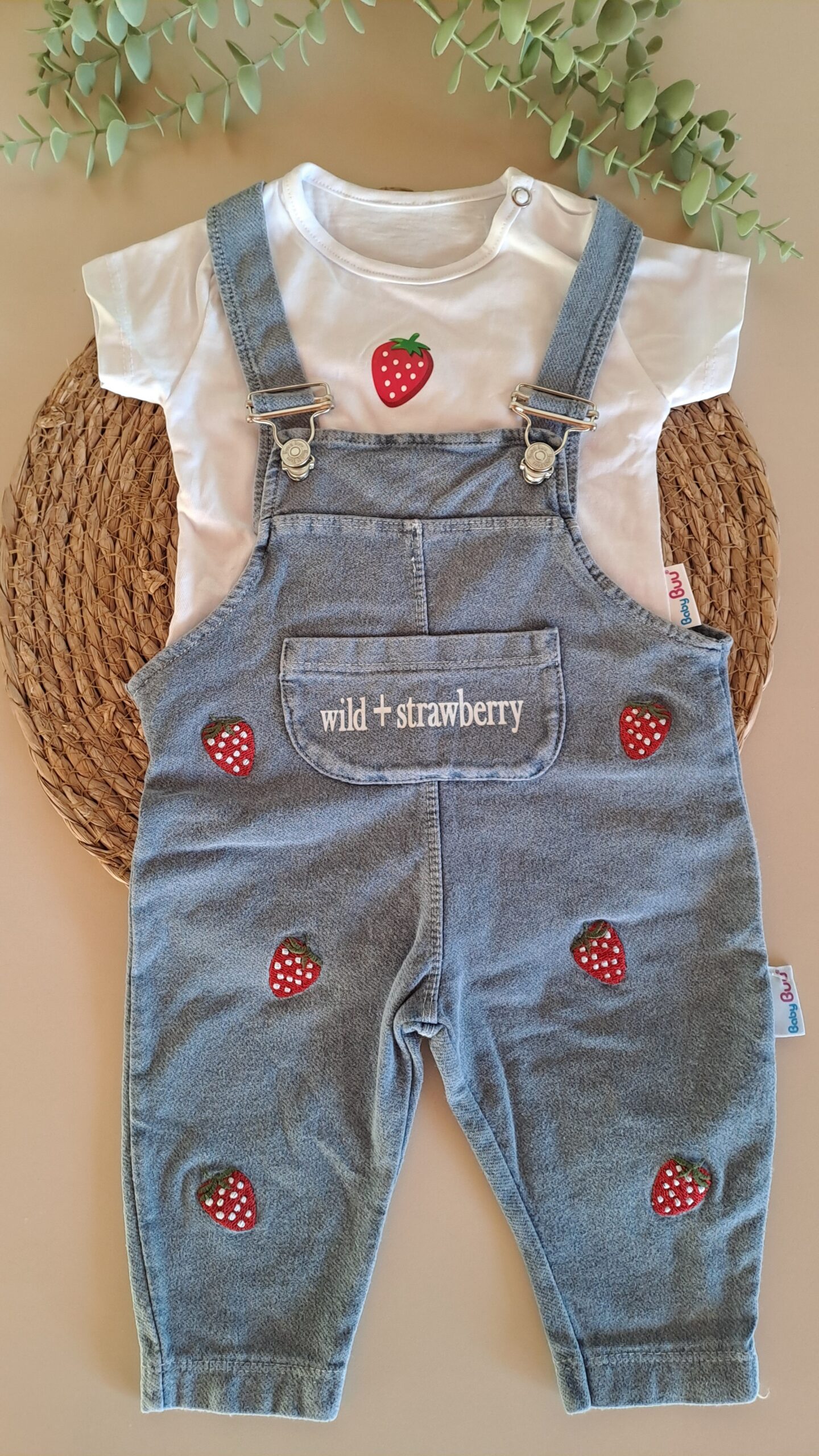 Pamuk Çilek Nakışlı Kot Salopet ve Tişört %100 Pamuk