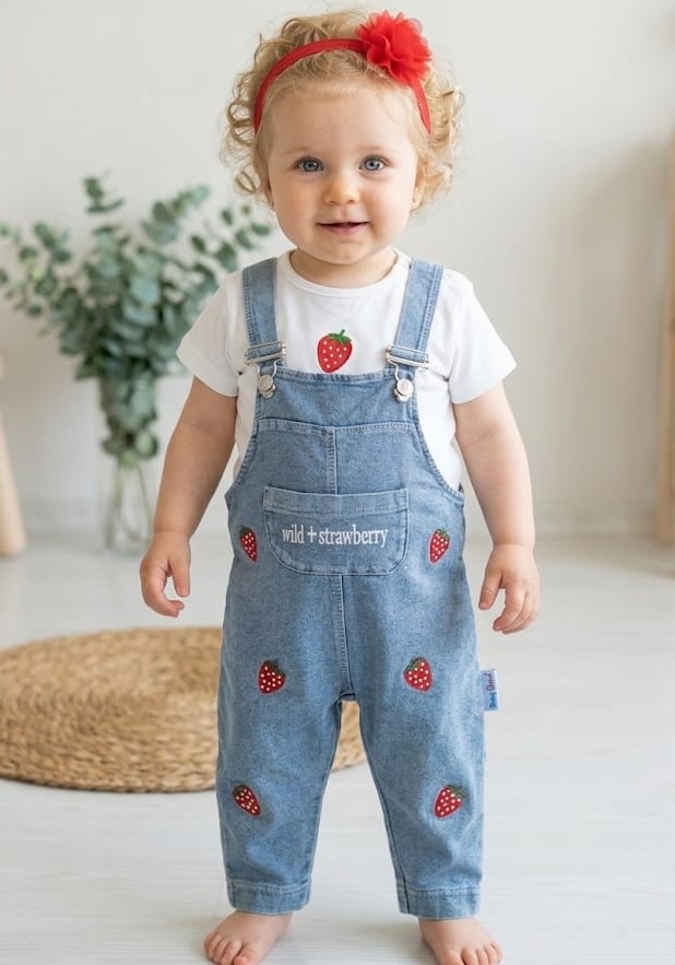 Pamuk Çilek Nakışlı Kot Salopet ve Tişört %100 Pamuk; klasik denim şıklığı, sevimli çilek figürleriyle yeniden yorumlandı. Ayarlanabilir askıları sayesinde uzun süreli kullanım imkanı sunan bu salopet, dayanıklı yapısıyla minik maceracıların en sevdiği parçası olacak. Tişörtlerle veya bodylerle kolayca kombinlenebilir. Zamansız, rahat ve şık bir modeldir. Yumuşak kot kumaşından üretilmiştir.