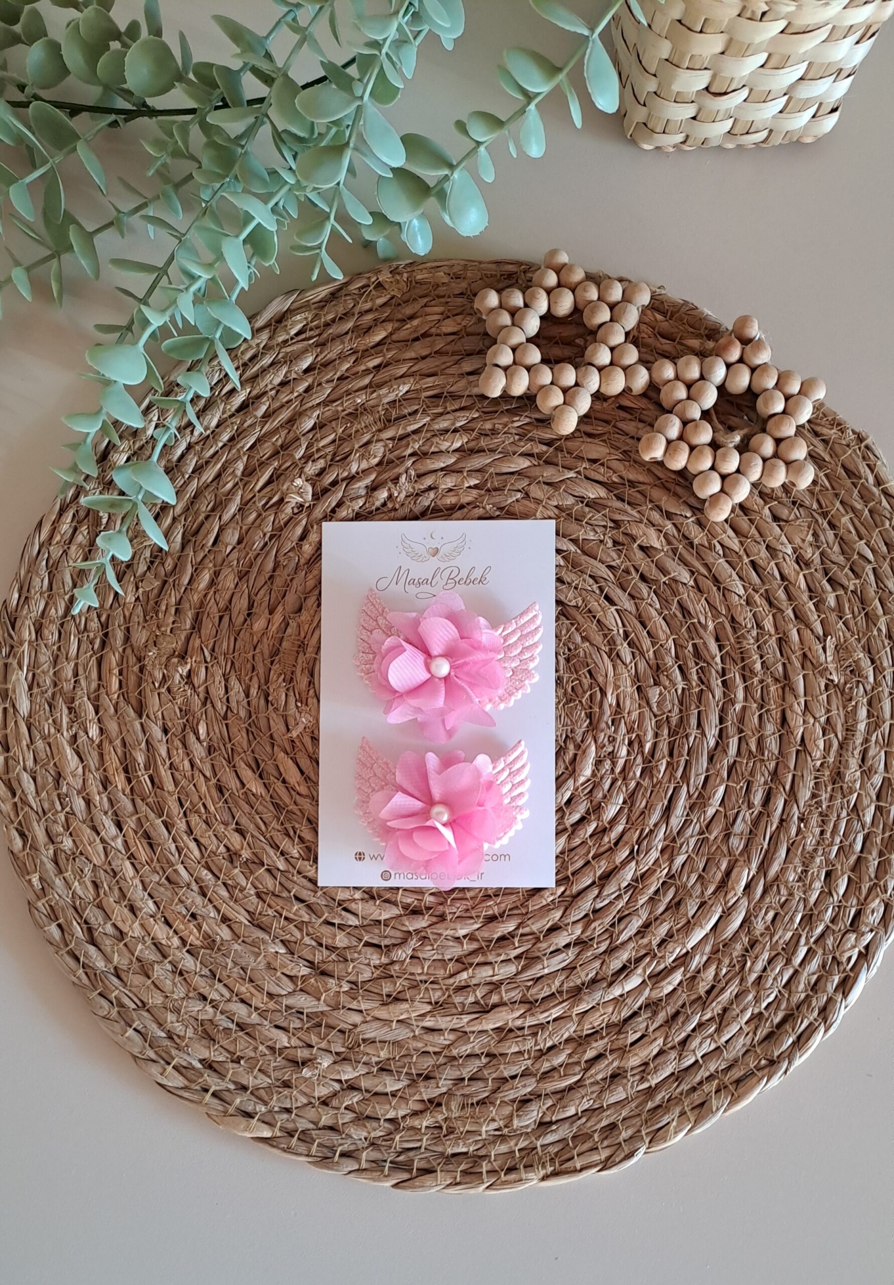 Pembe Melek Kanatlı Çiçekli Saçlı/Saçsız Bebek Tokası 2li Set