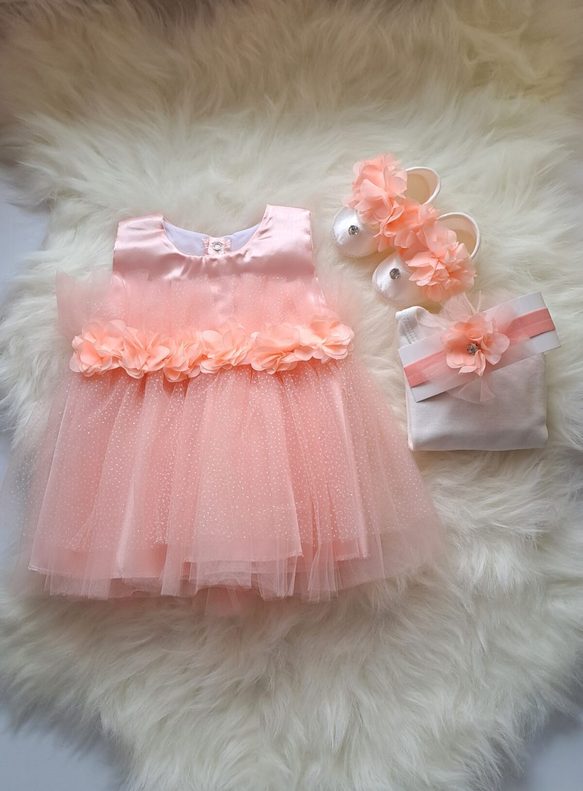 Özel günler için zarif ve şık bir tasarım sunar. Çiçek detayları ve parlak tül süslemeleriyle öne çıkan bu bebek mevlit takımı, minik prensesinizi adeta bir masal perisine dönüştürecektir. Yavrunuzun bu özel gününde fotoğraf çekimleri için de vazgeçilmez bir tercih olacaktır.