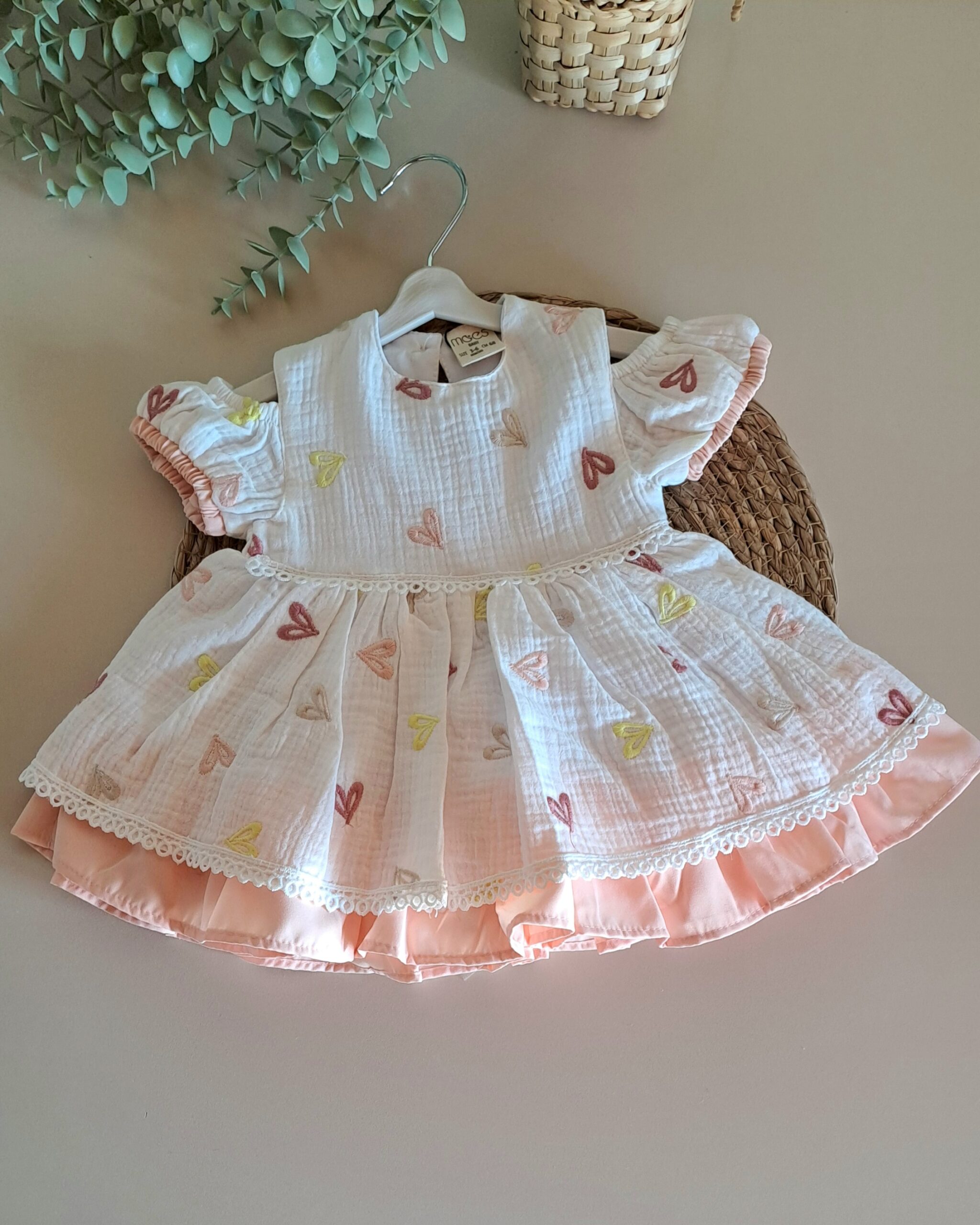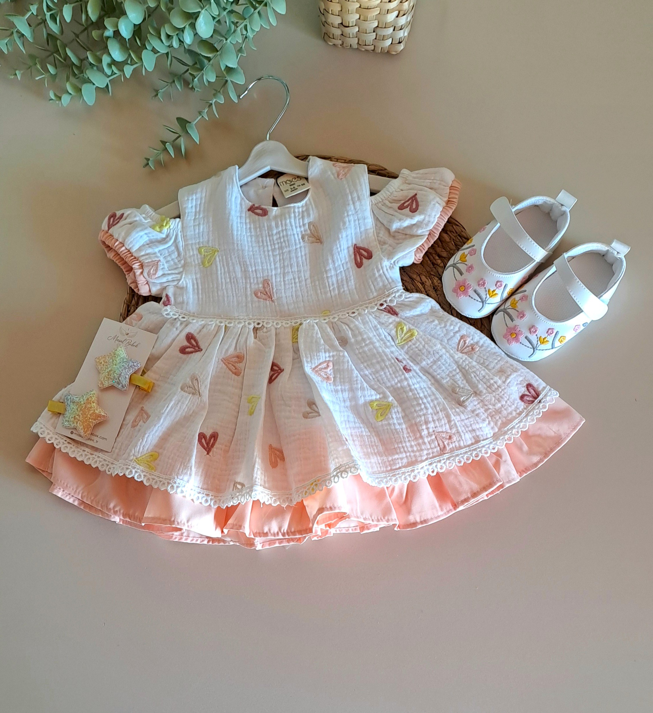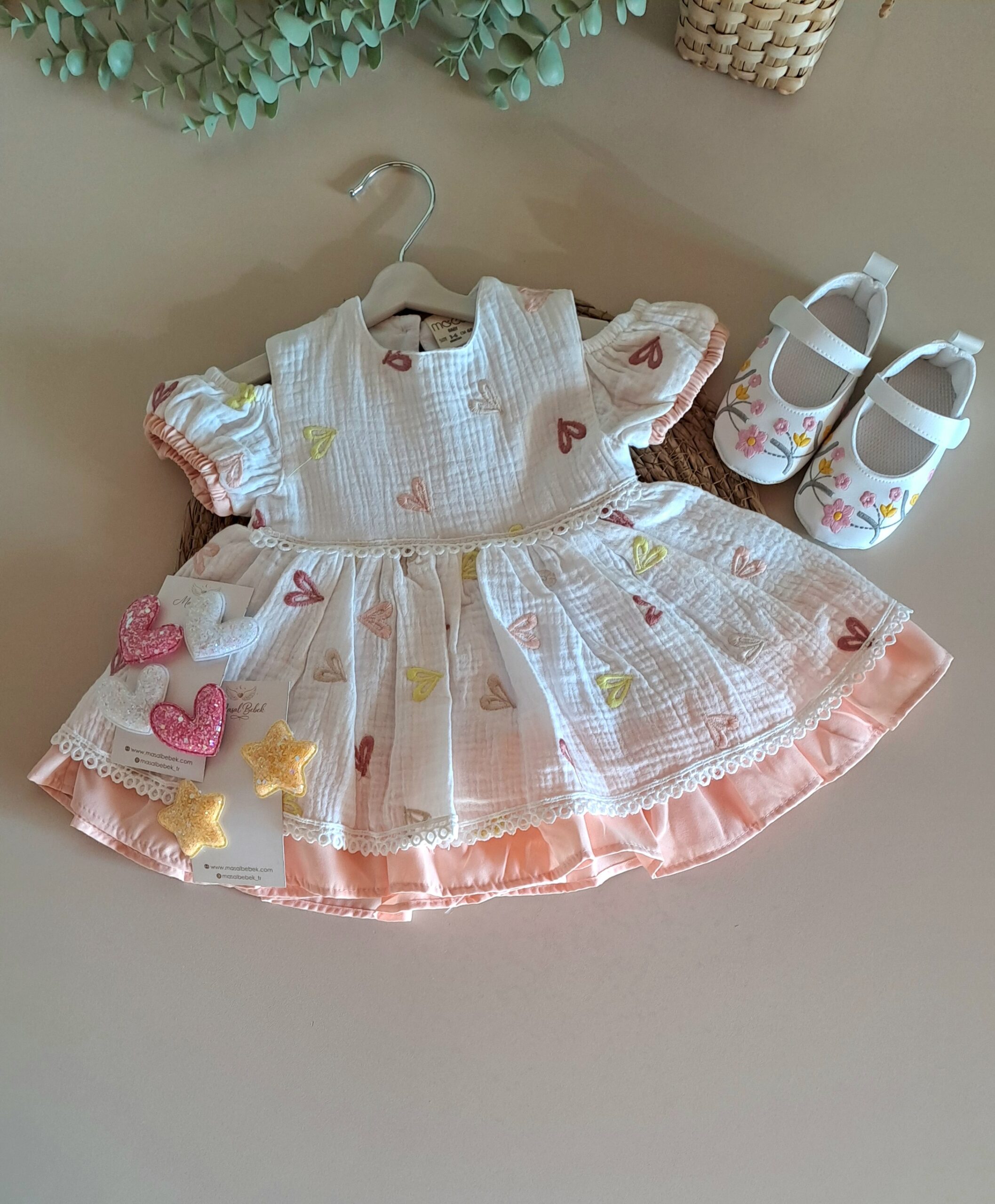 Renkli Kalpli Müslin Elbise %100 Pamuk; doğanın en saf dokunuşunu kalpli rengarenk neşeli detaylarla buluşturan elbisemiz, miniklerin dünyasına enerji katmaya geliyor. Tamamen doğal yapısı ve zamansız tasarımıyla, bebeğinizin konforunu şıklıkla taçlandırıyor. Üretim sürecinde kullanılan doğal pamuk iplikleri, miniklerin hassas cildine doğallığın en yumuşak dokunuşunu taşırken, içeriğinde hiçbir zararlı veya kanserojen madde barındırmaz. Hiçbir sentetik madde içermeyen, tamamen bitkisel kaynaklı pamuk dokuma.
