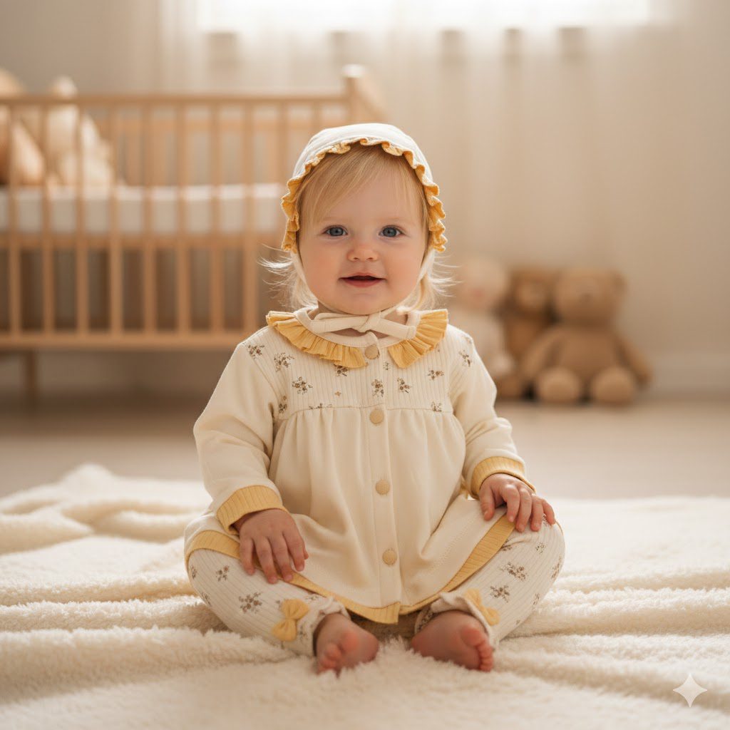 🎁 Tam Takım: Şapkası, eldiveni ve önlüğü ile şık bir hastane çıkışı ve harika bir hediye seçeneği.