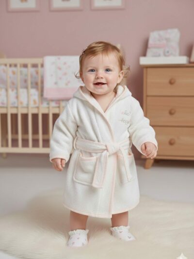 Kapüşonlu Bornoz: Belden bağlamalı, kenarları turuncu biyeli ve kapüşonunda nakışlı bir zürafa figürü bulunuyor.