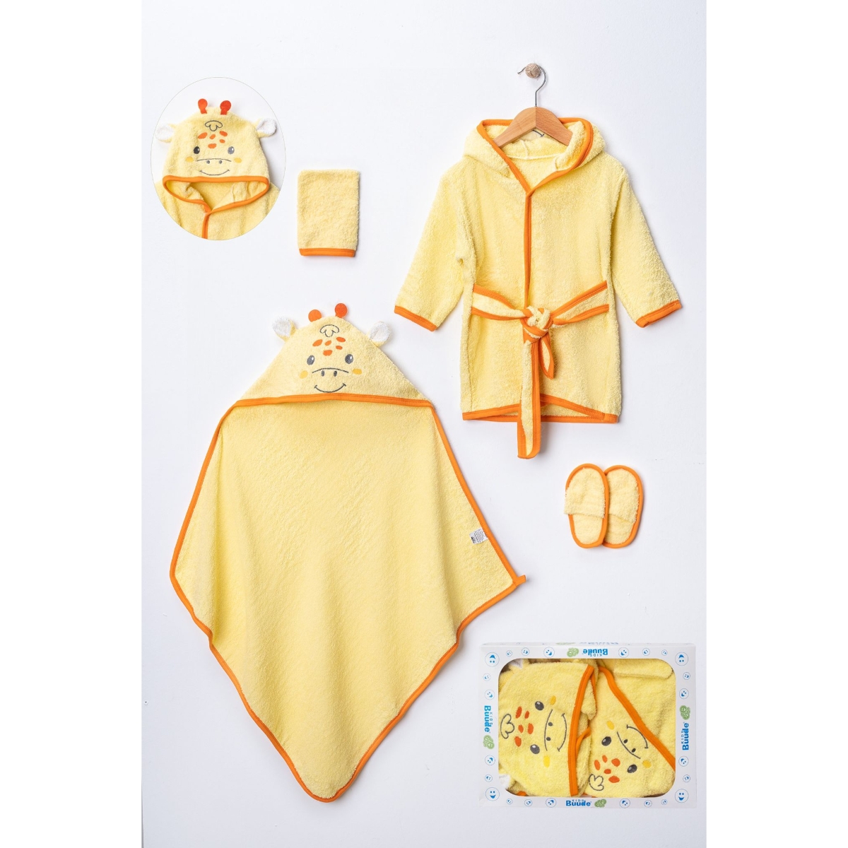 Oldukça sevimli bir 0-12 Ay Bebek Bornoz Seti. Sarı rengi ve zürafa temalı tasarımıyla hem kız hem de erkek bebekler için uygun (unisex) bir set.