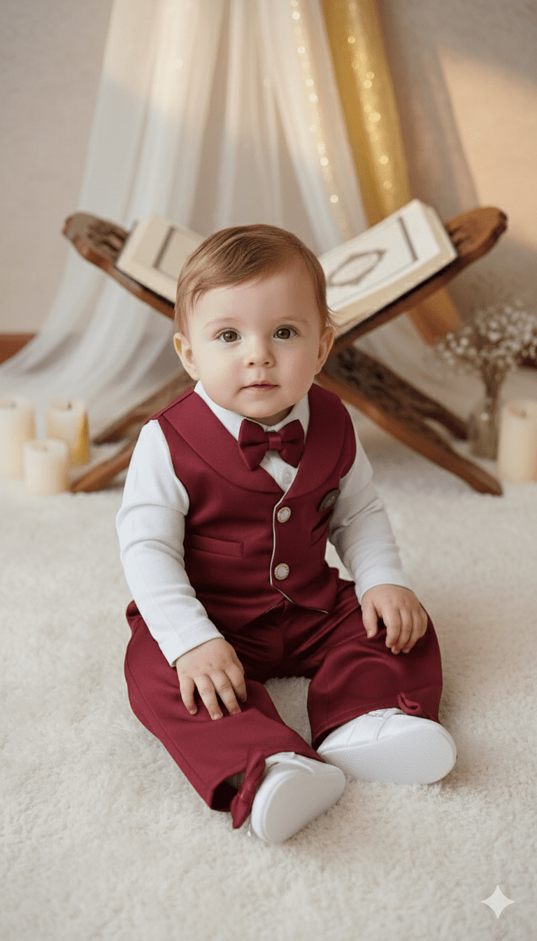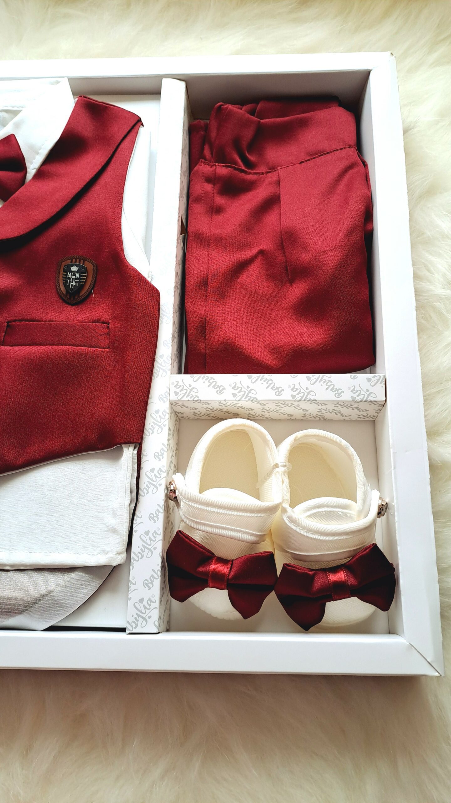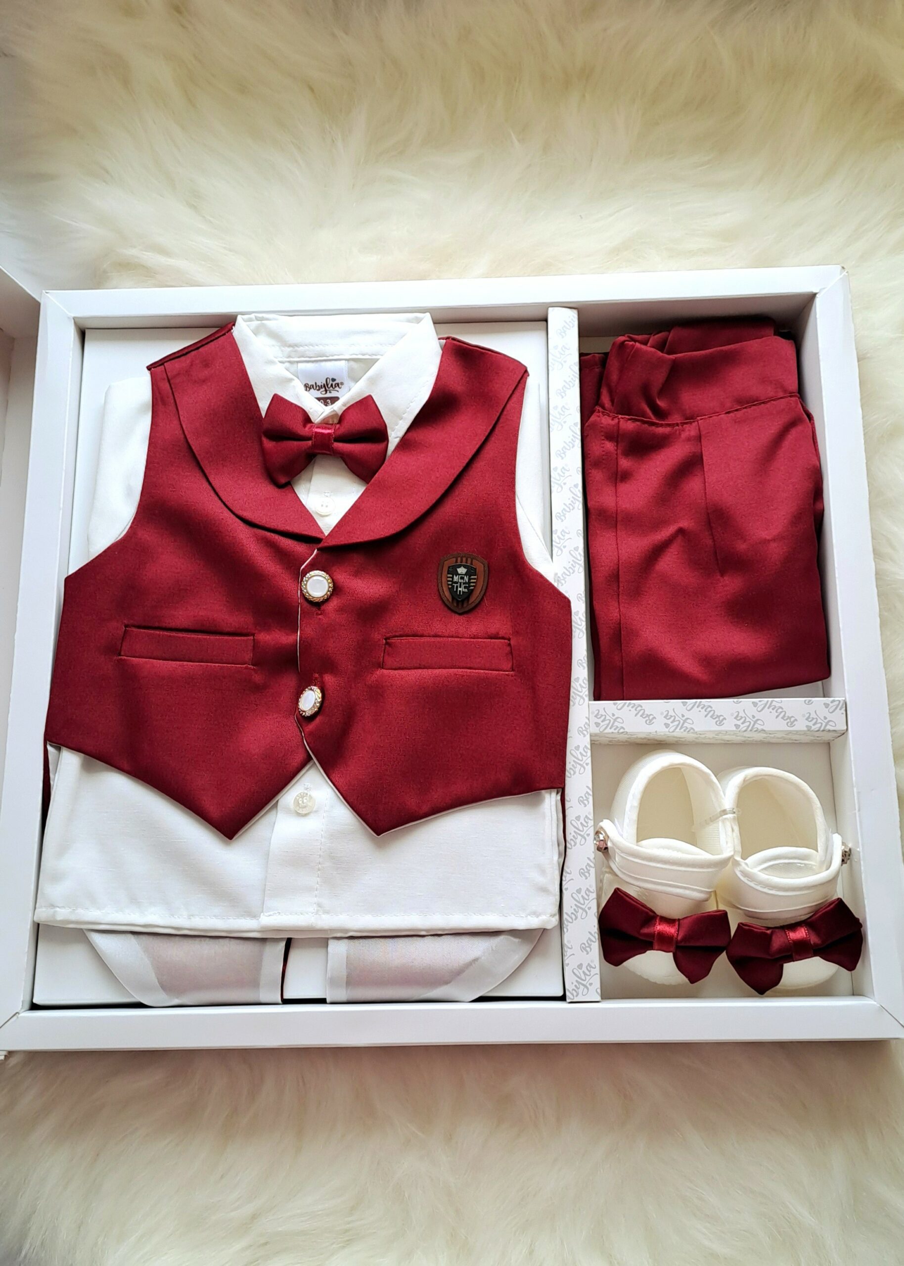 Erkek smokin premium mevlit takımı bordo, bebek mevlitleri ve özel günler için şık ve klasik bir görünüm sunar. Setin içerisinde 1 adet yelek ve papyon detaylı gömlek, bir çift patik ve (kumaştan dikilmiş) pantalon bulunuyor. Smokin detaylı tasarımı sayesinde erkek bebekler için zarif ve asil bir stil oluşturur.