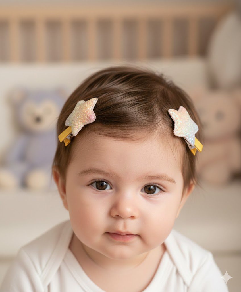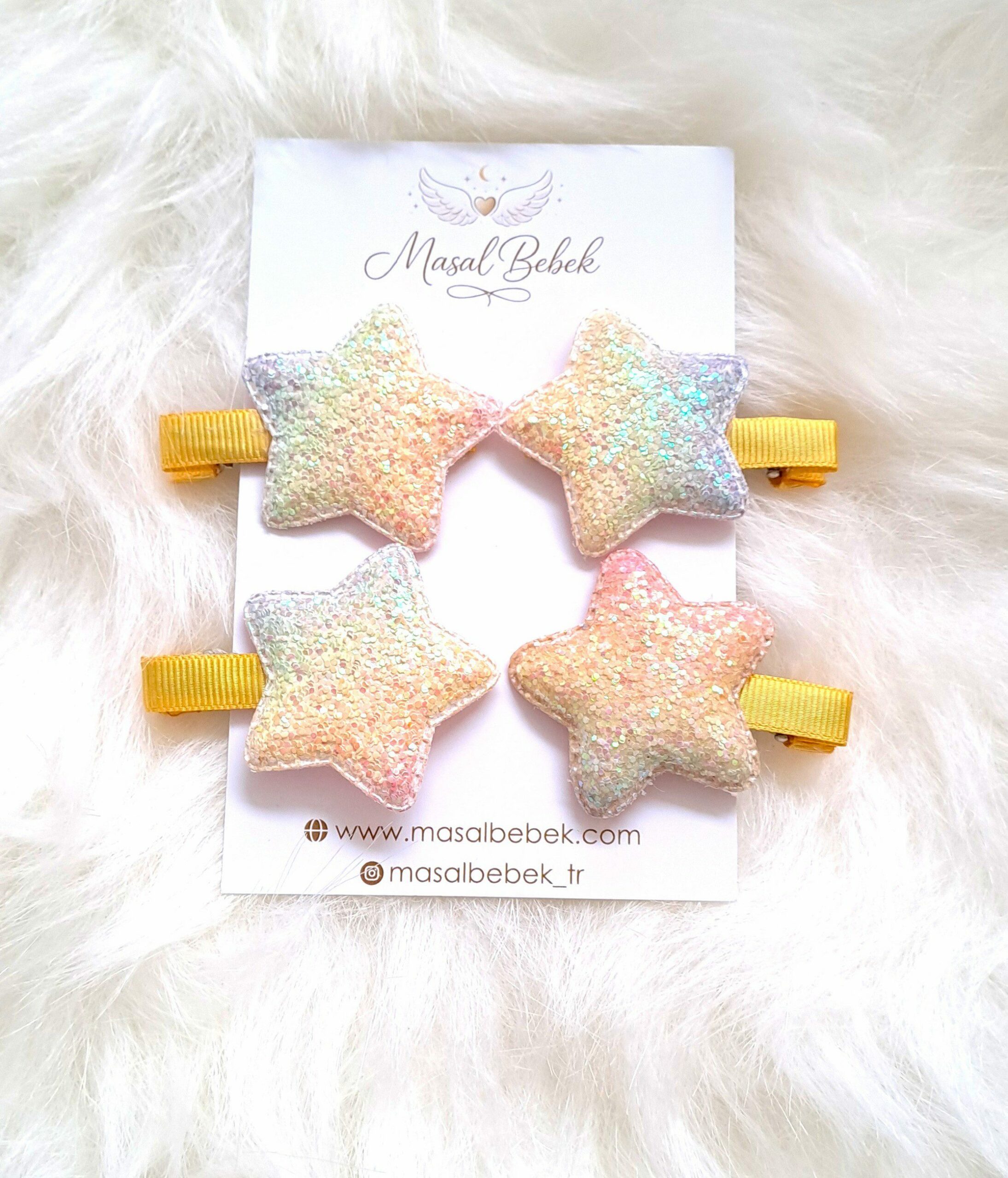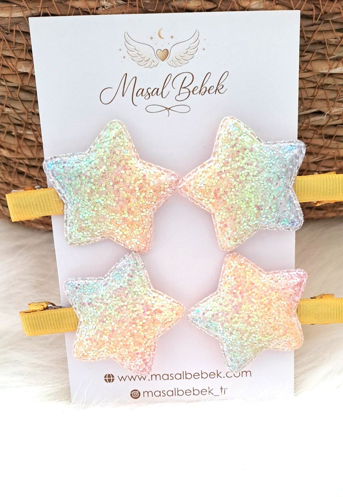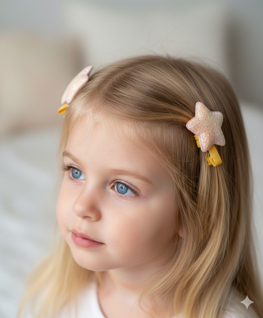 Yıldız detayı ve zarif ışıltısıyla tasarlanan yıldız ışıltılı tokalar, bebek ve çocuk saçlarına şık bir görünüm kazandırır. Hafif yapısı sayesinde saçta ağırlık yapmaz, gün boyu konforlu kullanım sunar. Günlük kombinlerden özel günlere kadar rahatlıkla tercih edilebilir. İkili set halinde gönderilmektedir.